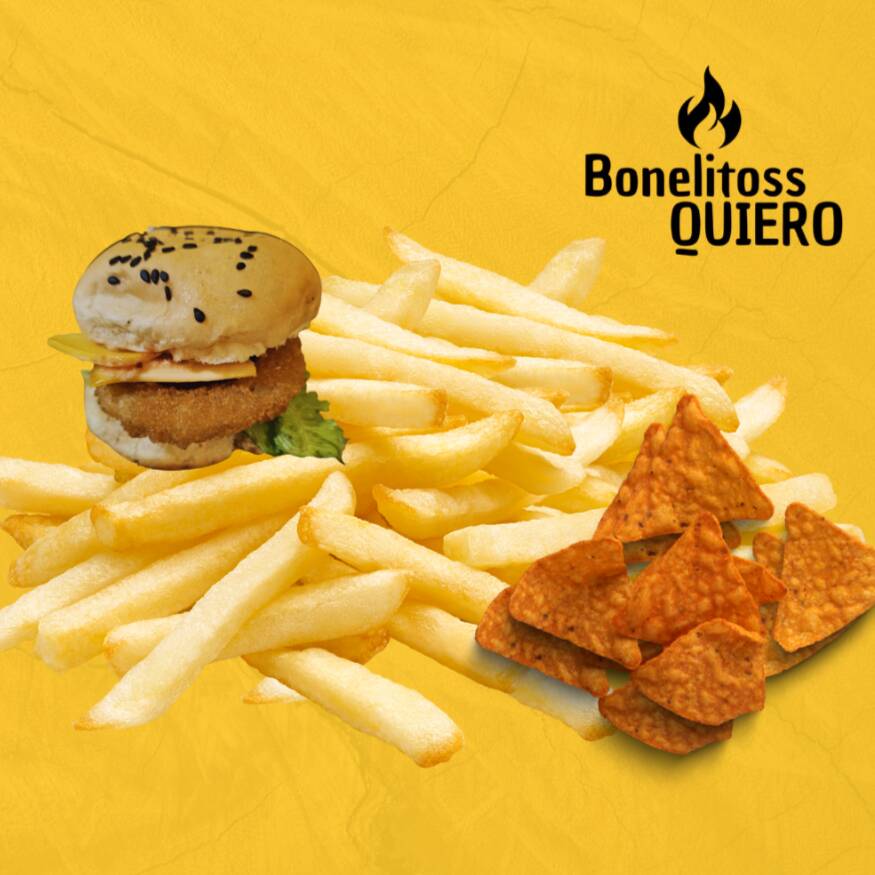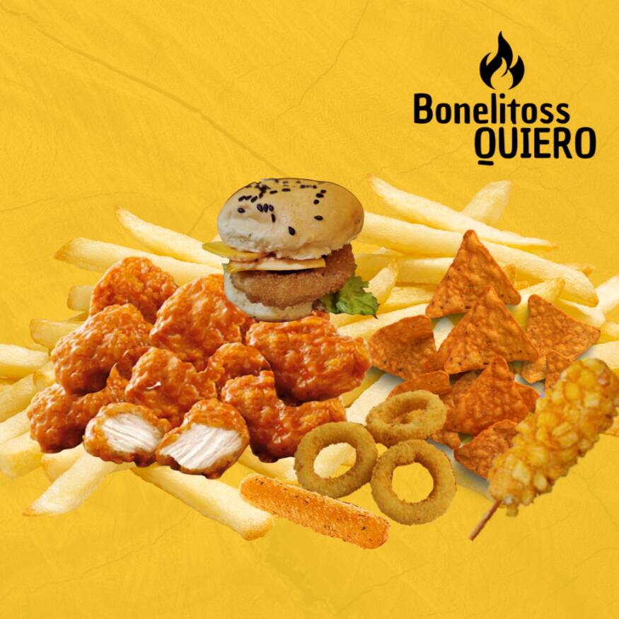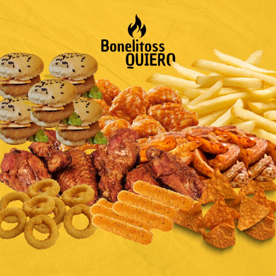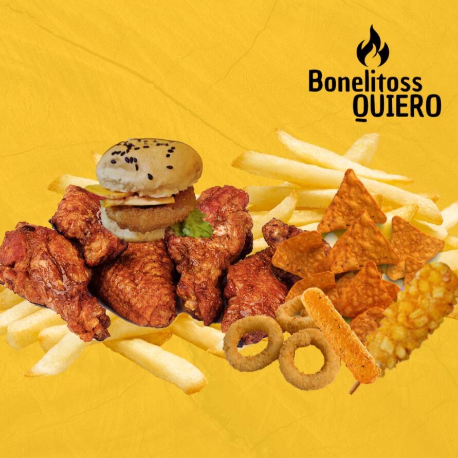 8-10pzas de Deliciosos Bonelitoss Bañados en Salsa de tu Elección Acompañados de 250gr de Papas a la Francesa con el Toque Bonelitoss, 1 Minihamburguesita, 3 Aros de Cebolla, 1 Banderilla Coreana de Salchicha con Queso, 1 Dedo de Queso y Topping de Frituras