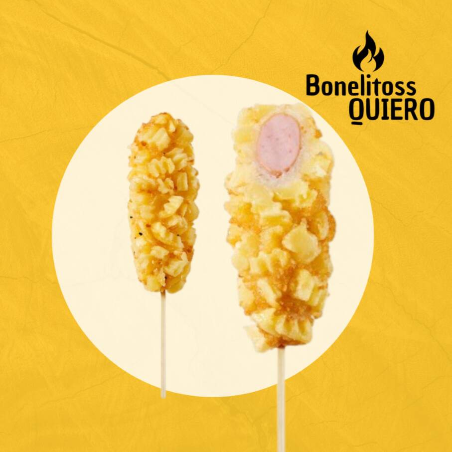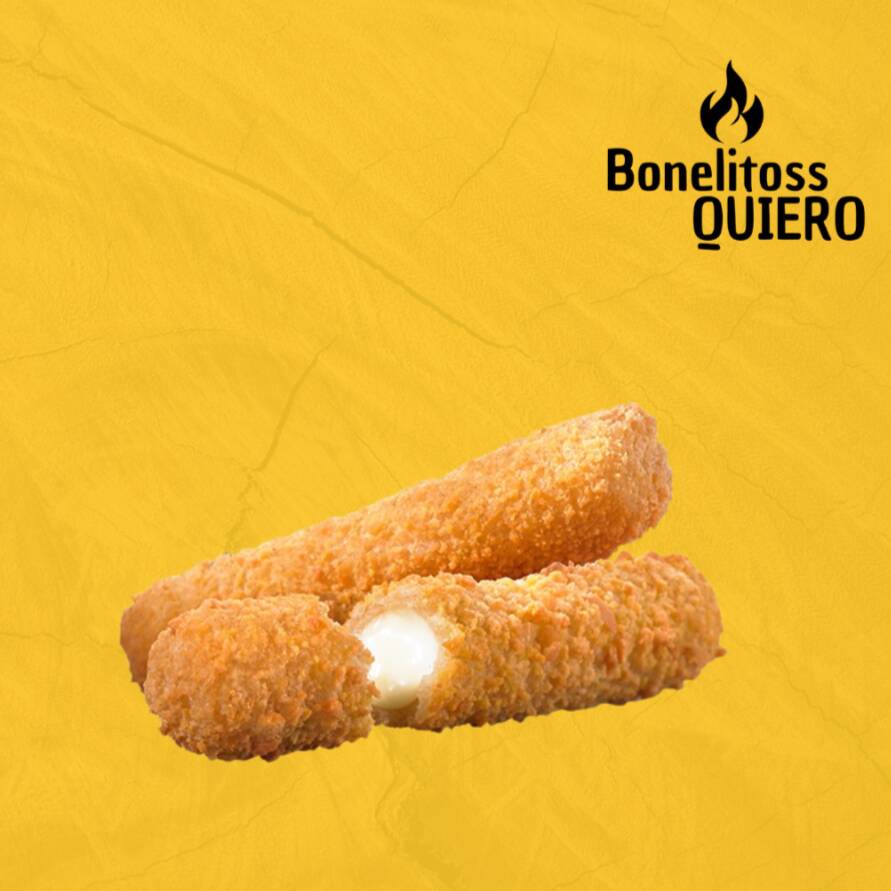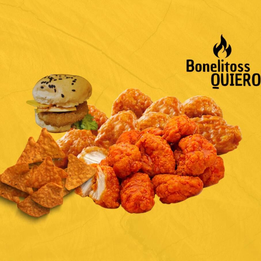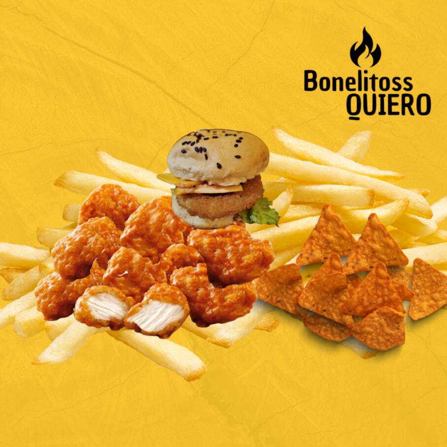 8-10pzas de Deliciosos Bonelitoss Bañados en Salsa de tu Elección Acompañados de 250gr de Papas a la Francesa con el Toque Bonelitoss, 1 Minihamburguesita, 3 Aros de Cebolla, 1 Banderilla Coreana de Salchicha con Queso, 1 Dedo de Queso y Topping de Frituras