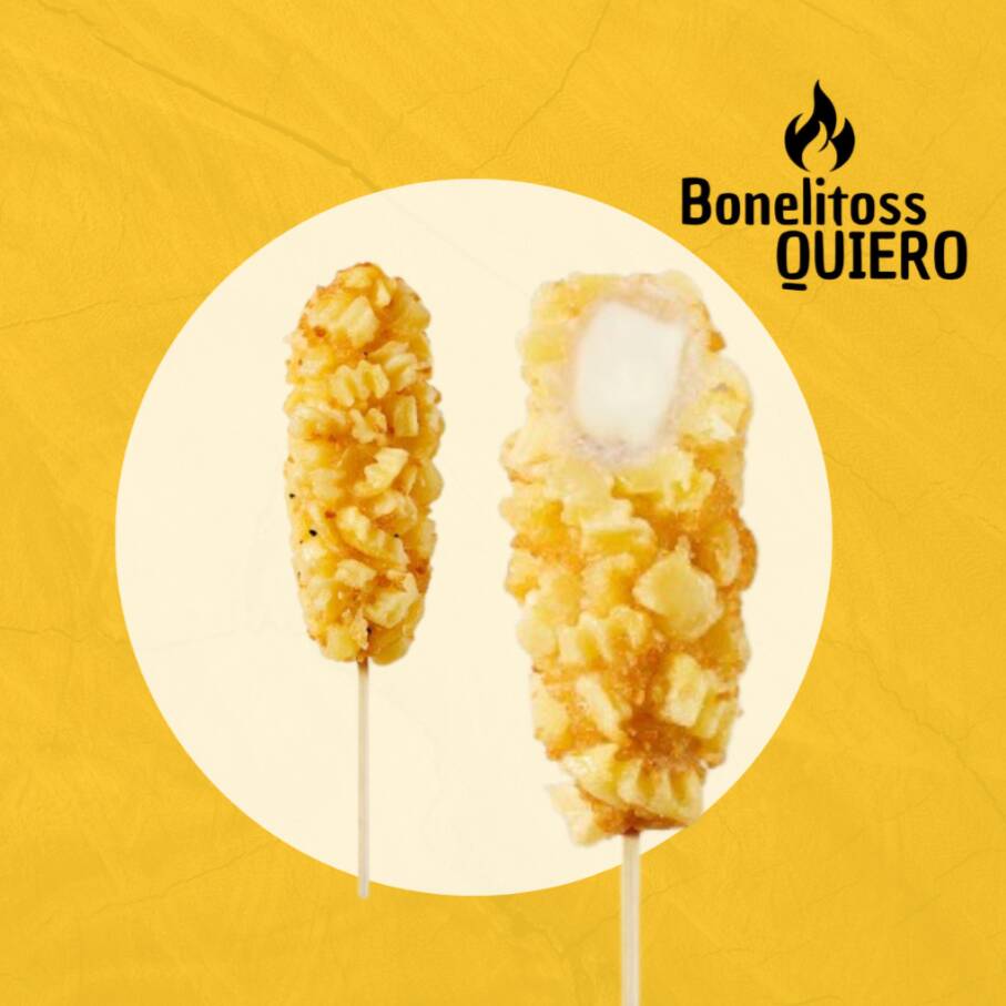 Brocheta de Queso Frita Con Cubierta Crujiente de Papa. Incluye sobre de catsup, mayonessa y salsa.
