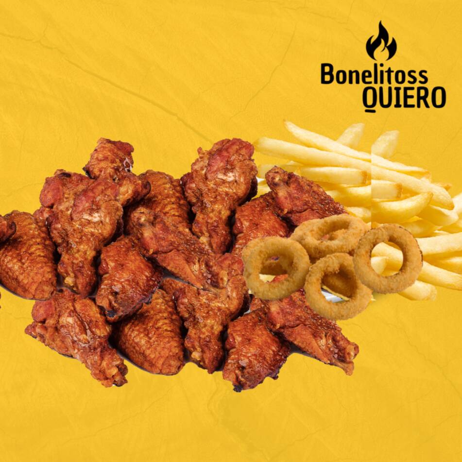 20 Jugosas Alitas Bañadas en Salsa de Tu Elección Acompañadas de 500gr de Papas a la Francesa con el Toque Bonelitoss y 4 Aros de Cebolla