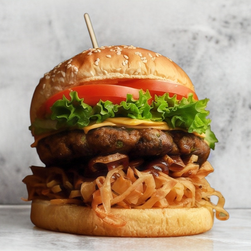 140Gr de carne, doble queso amarillo, salsa bbq, pan artesanal, lechuga, jitomate y cebolla frita