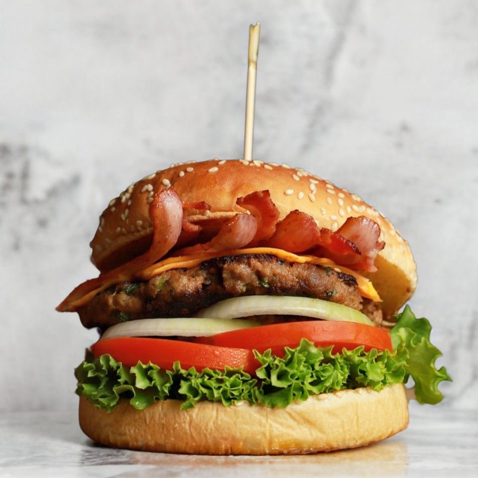 140 Gr de carne, tocino frito, doble queso amarillo, lechuga, jitomate, cebolla, pan Artesanal