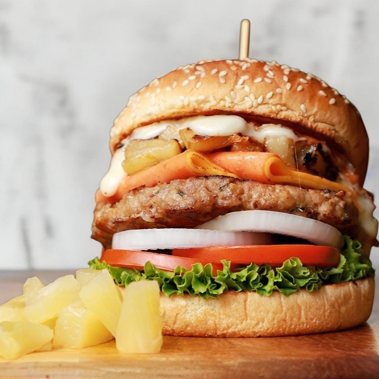140gr de carne, queso amarillo, jamon, piña asada, queso asadero, lechuga, jitomate, cebolla, pan artesanal