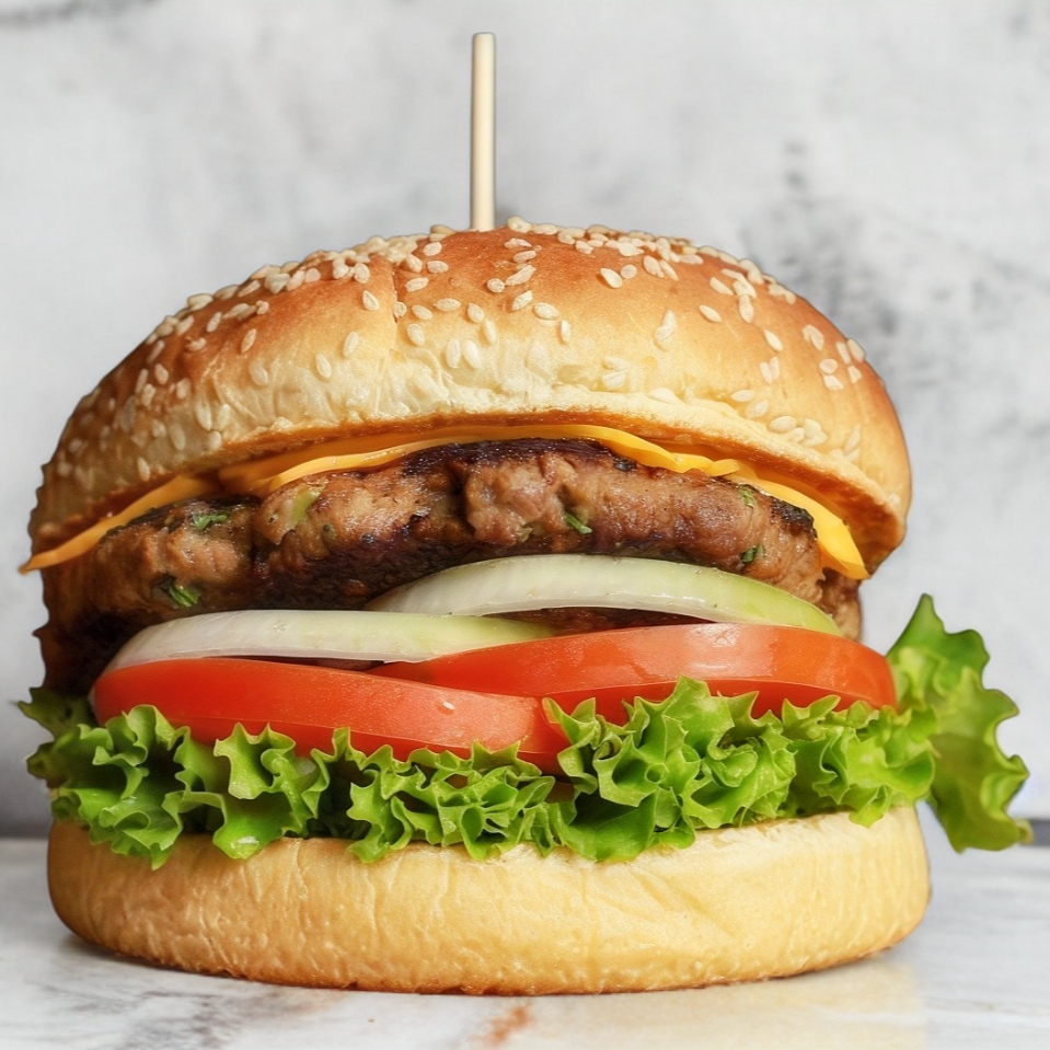 140 gr de carne, doble queso amarillo, lechuga, jitomate, cebolla, pan artesanal