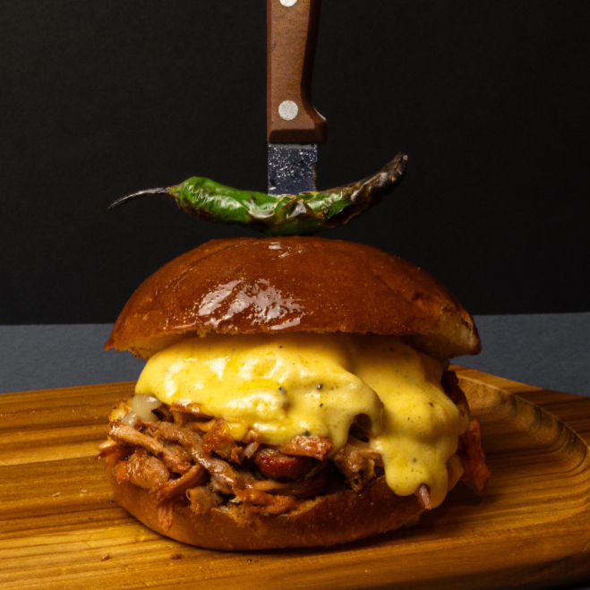 150g. de Nuestro delicioso pulledpork con mas de 12 hrs de ahumado carne suave e irresistible bañada con nuestra famosa salsa BBQ artesanal, acompañada con queso monterrey Jack, queso americano y nuestra irresistible salsa de chedar uno de nuestros platillos mas especiales