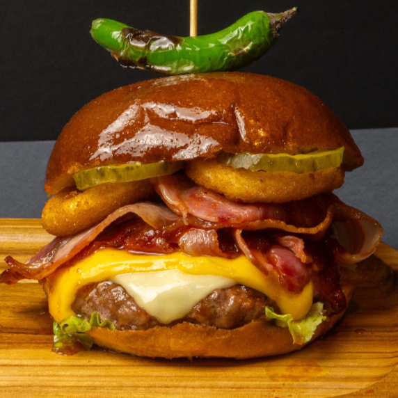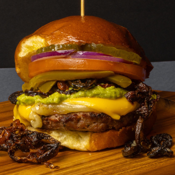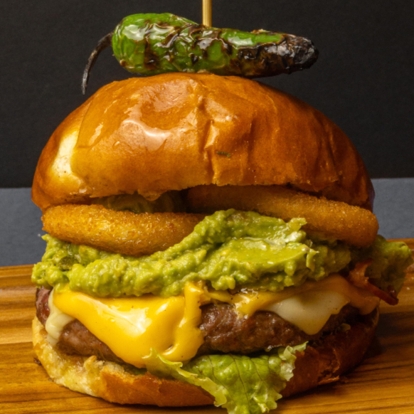 Pan brioche artesanal, carne de 100gr al carbón, doble queso(chihuahua y americano) tocino horneado, aros de cebolla dorados, Guacamole recien hecho, jitomate, cebolla morada y lechuga sangria