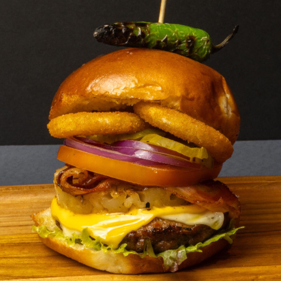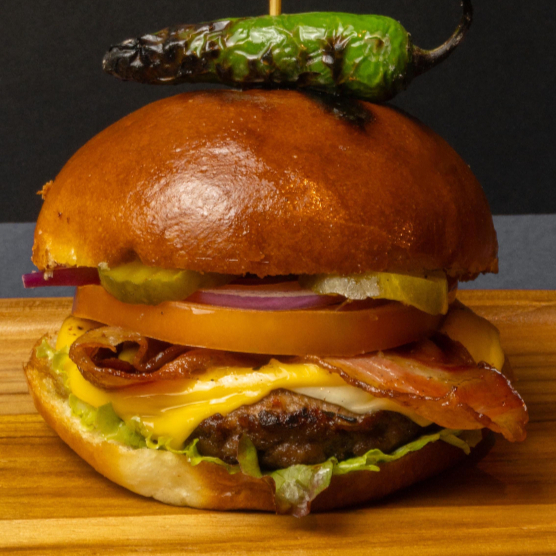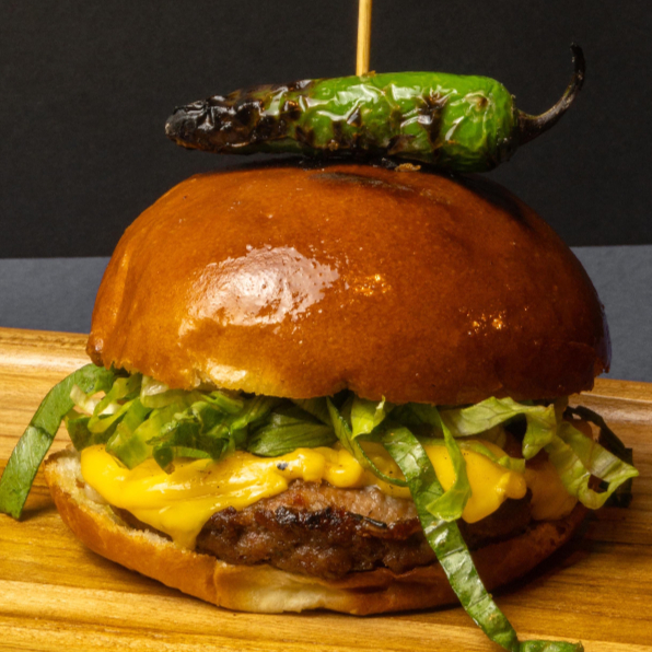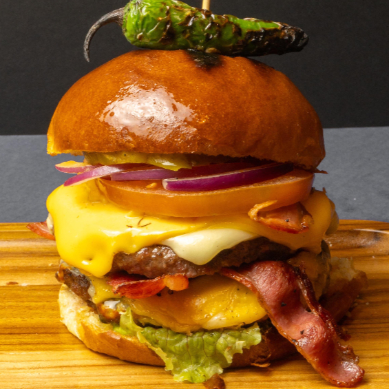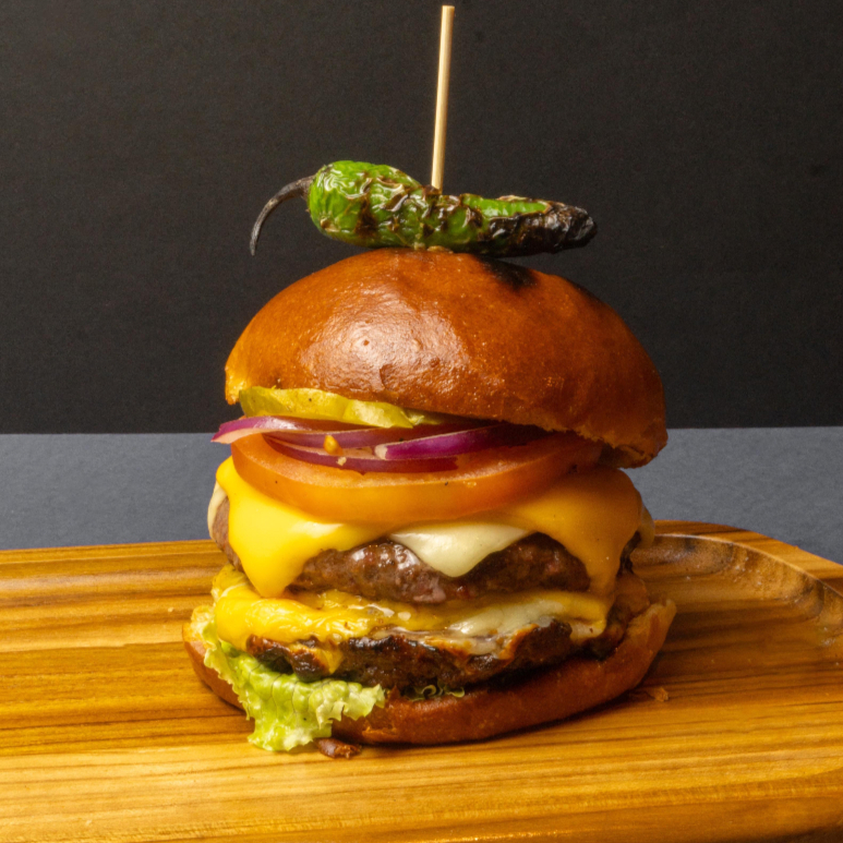 Hamburguesa de 150 g. de carne, doble queso( monterrey jack y queso americano) guacamole recien hecho, chicharrones de habanero y jalapeño, chiles en vinagre, jitomate, cebolla morada, pepinillos