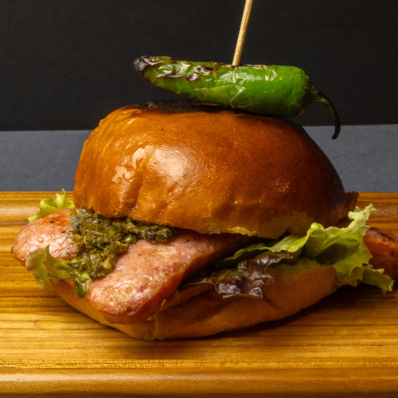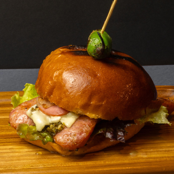 Pan brioche artesanal, chorixo argentino a las brasas, con tocino ahumado, lechuga sangria fresca, mayonesa, Queso Monterrey Jack, Queso azul, sabor ahumado