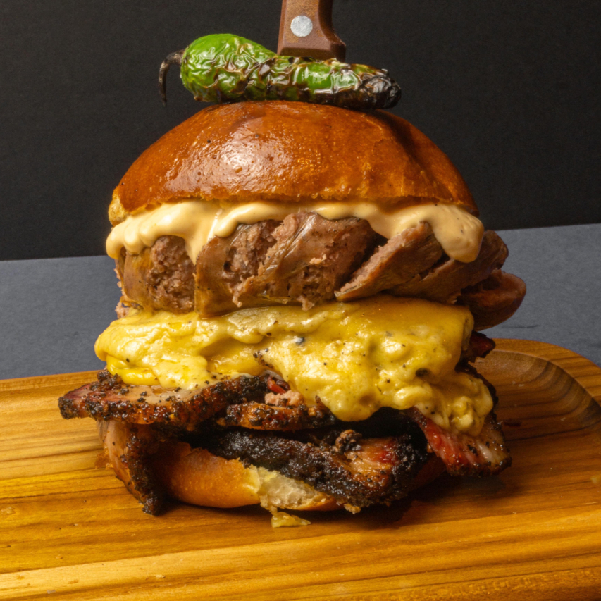 250g de brisket ahumado durante 14hrs carne suave y sabor irresistible, combinacion de quesos(americano monterrey jack) con nuestra cremosa salsa de queso chedar, todo esto envuelto en un delicioso pan brioche.