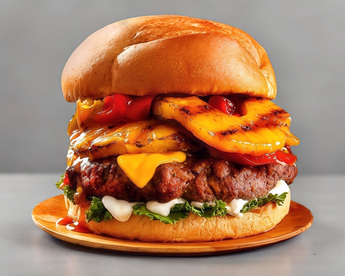 Hamburguesa con 150 grs de carne mezcla especial de la cada aderezada con un toque de bbq, acompañada de piña asada, queso cheddar, lechuga, jitomate y cebolla en pan artesanal.