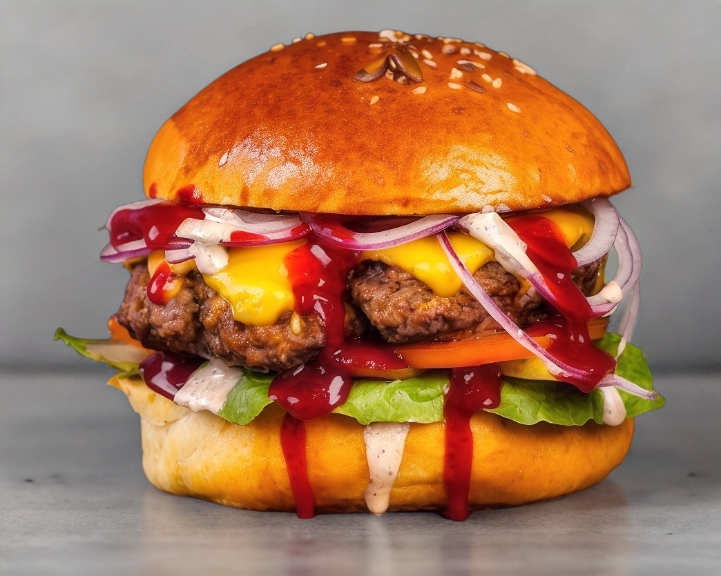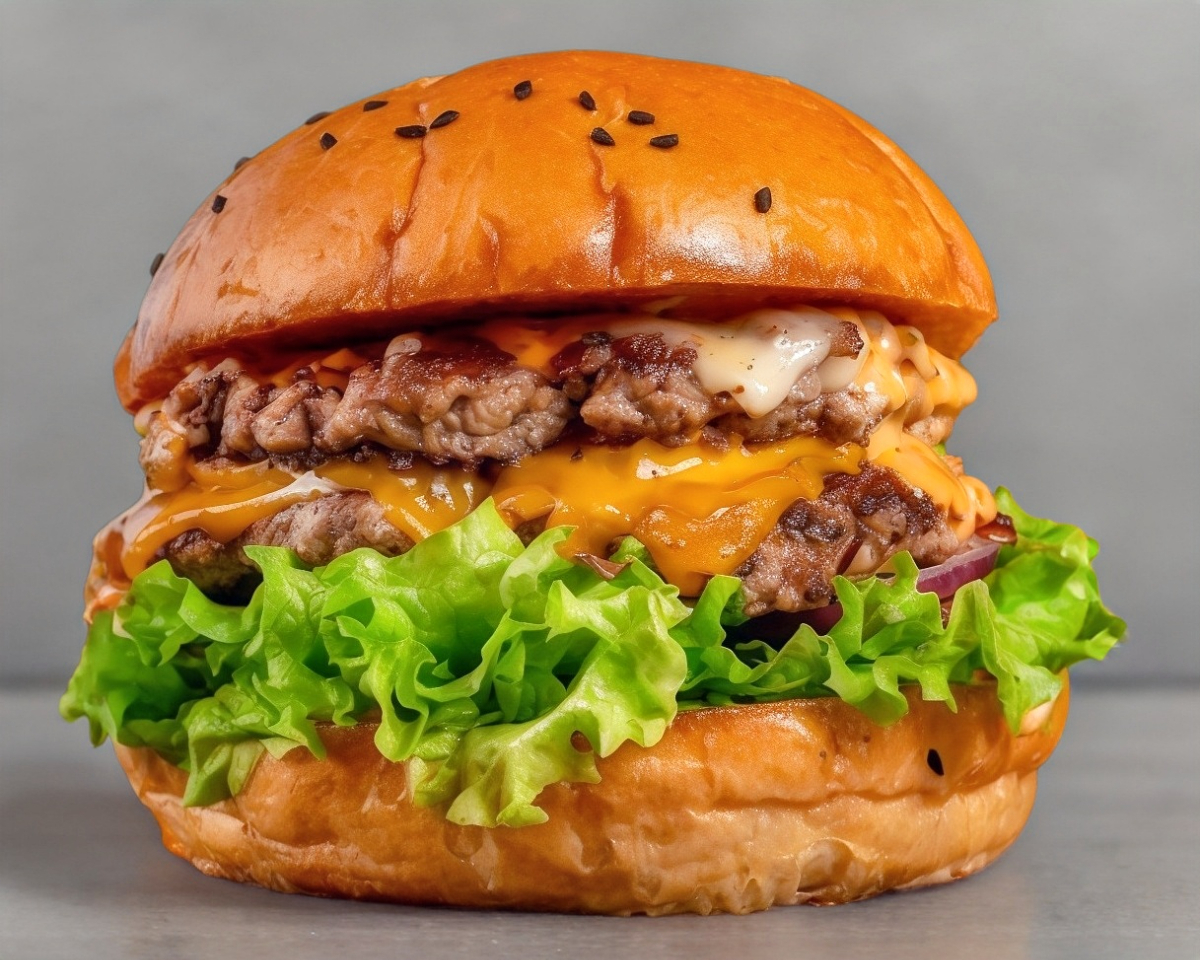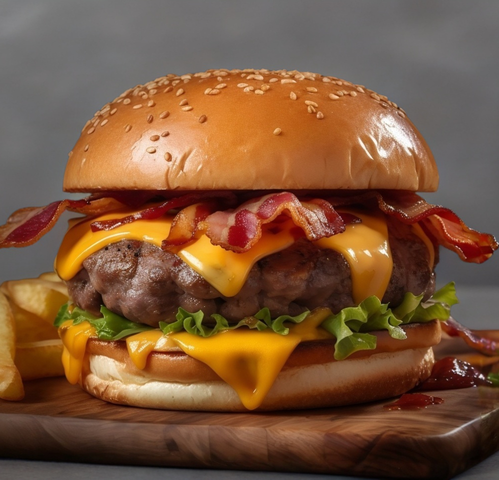 Una de nuestras hamburguesas más grandes con doble carne (300 grs total) doble porción de tocino, doble porción de queso cheddar, con un toque de bbq, jitomate, cebolla y lechuga en pan artesanal (Sólo apta para glotones)