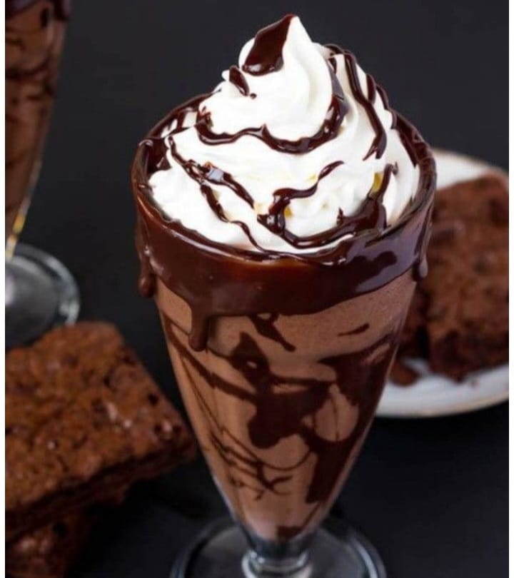 Extracción de café, chocolate, hielo, leche, crema batida más chocolate y chispas.