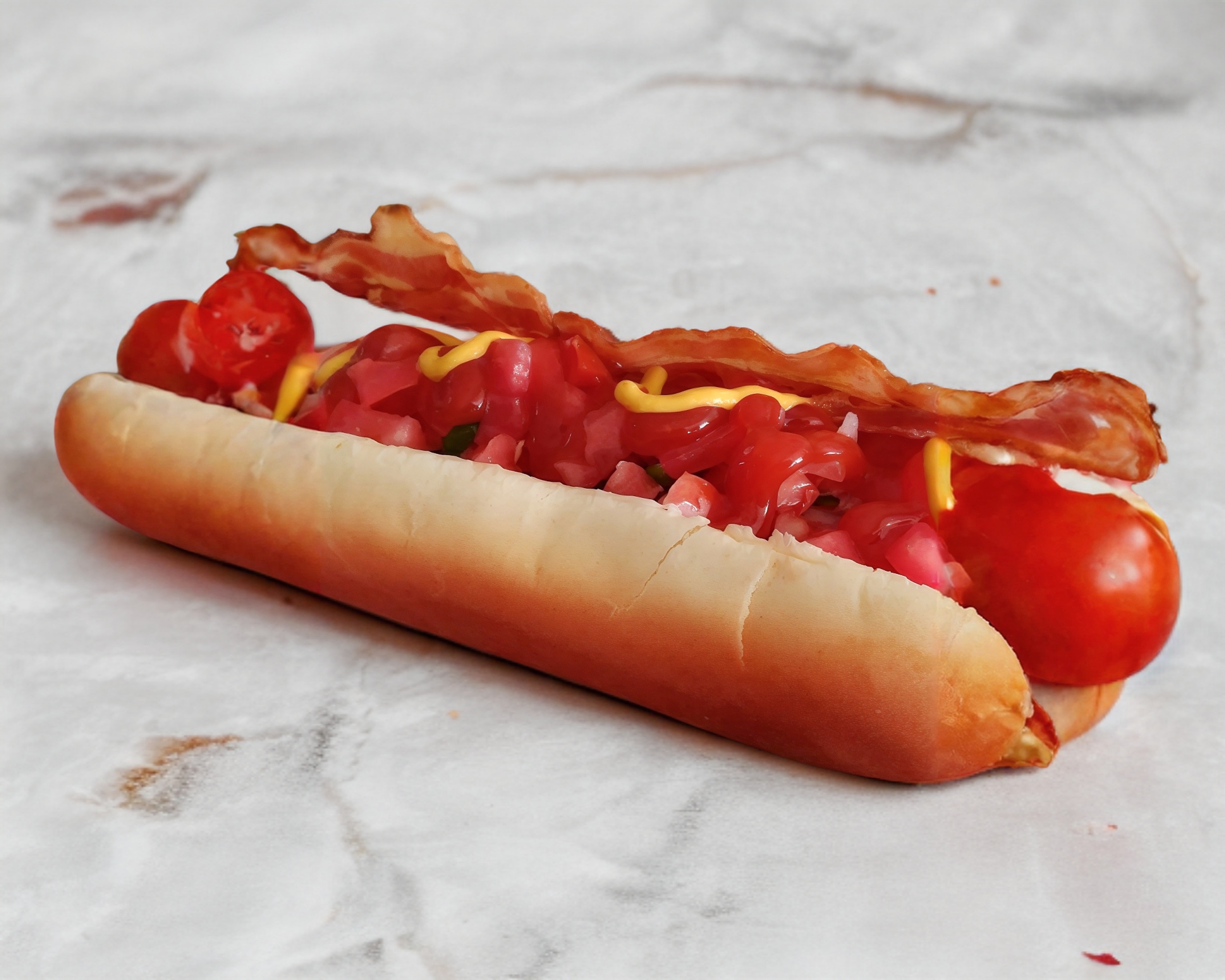 Delicioso con salchicha de pavo, tocino, jitomate, cebolla, catsup, mostaza, mayonesa y chile..