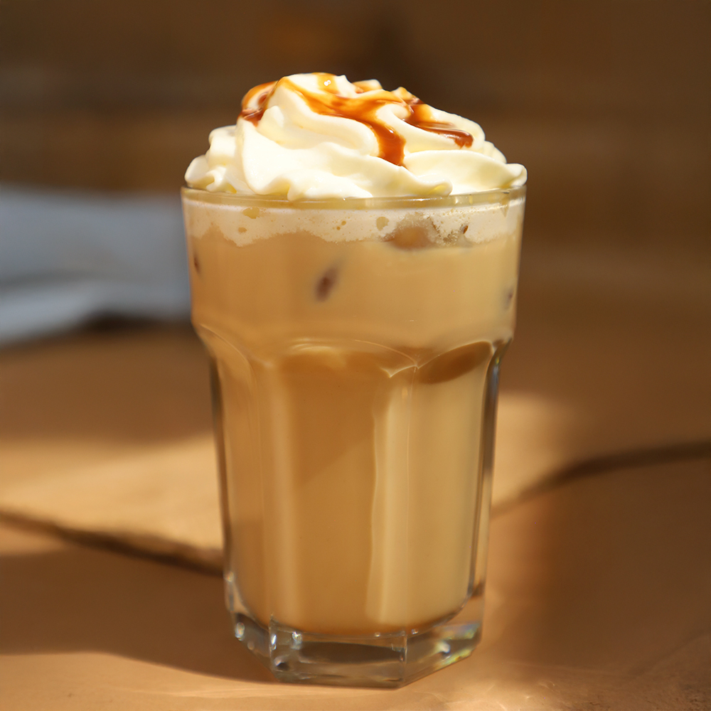 Latte frío con un toque de caramelo y decorado con salsa de caramelo.
