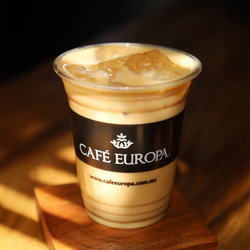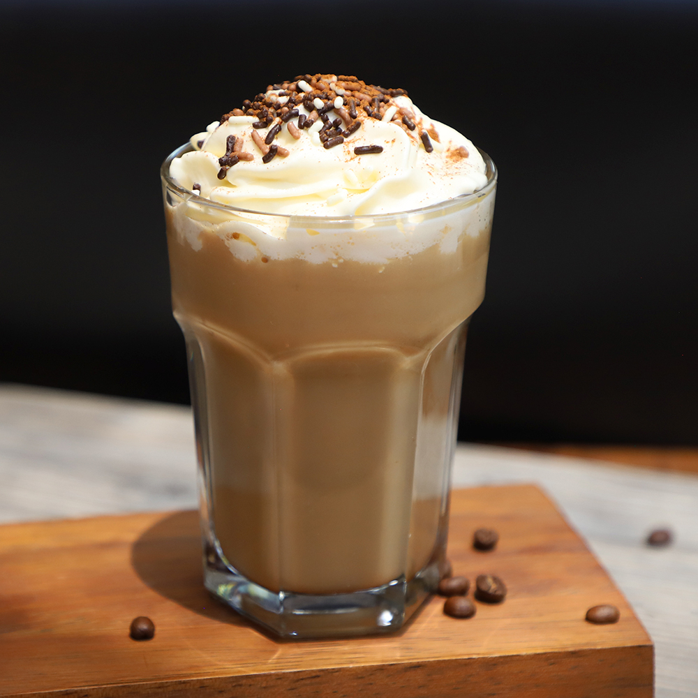 Bebida a base de café, leche deslactosada, chocolate líquido y textura granizada.