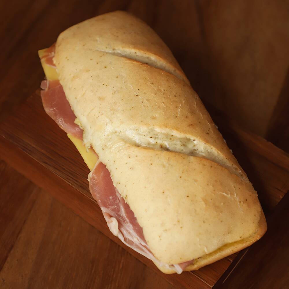 Delicioso panino de jamón serrano, queso gouda y philadelphia.