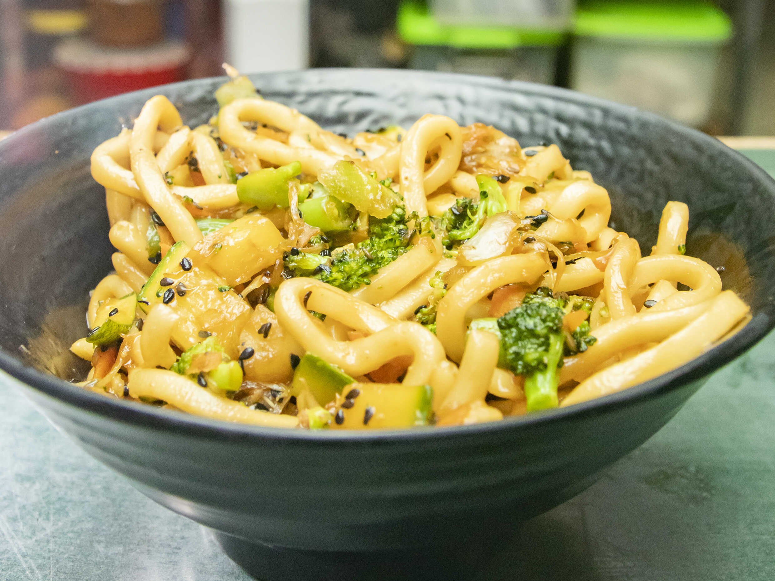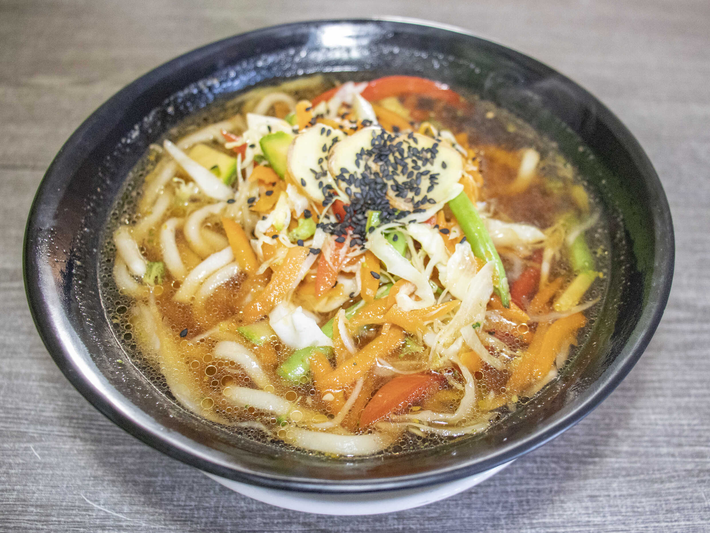 Pasta Udon en caldo con soya, condimento de marisco molido, repollo y zanahoria rayada, calabacita y brócoli, jengibre y ajonjolí.