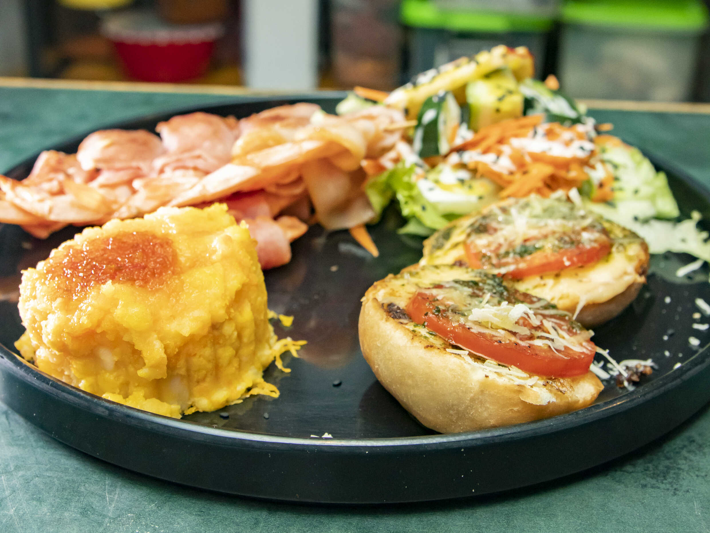 Pulpo salteado al ajillo en trozos sobre una costra de queso mozarela, acompañado de guarniciones de ensalada y pure de papa con dos montaditos italianos.