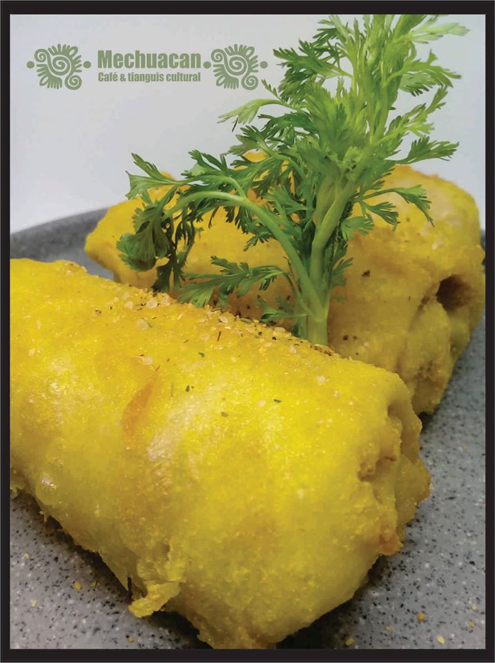 3 Rollitos de harina fritos en tempura de cúrcuma, rellenos con queso mozarela y repollo con zanahoria rayada, pequeños trozos de pollo y tocino, mas aderezo de cúrcuma y cajún.