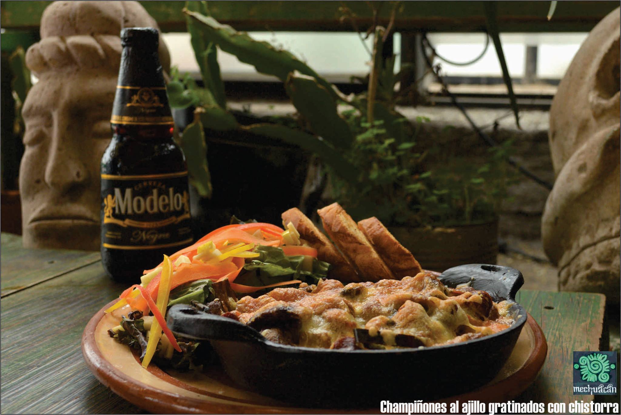 Champiñones salteados con ajo y guajillo, acompañados con pure de papa, ensalada, pan y 100 gr de chistorra.