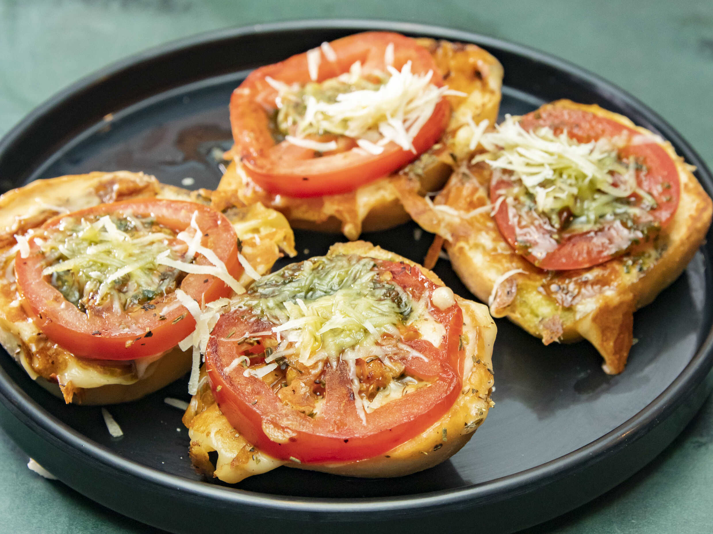 4 tapitas de pan con queso mozarela fundido, jitomate asado con especias, pesto y queso parmesano.