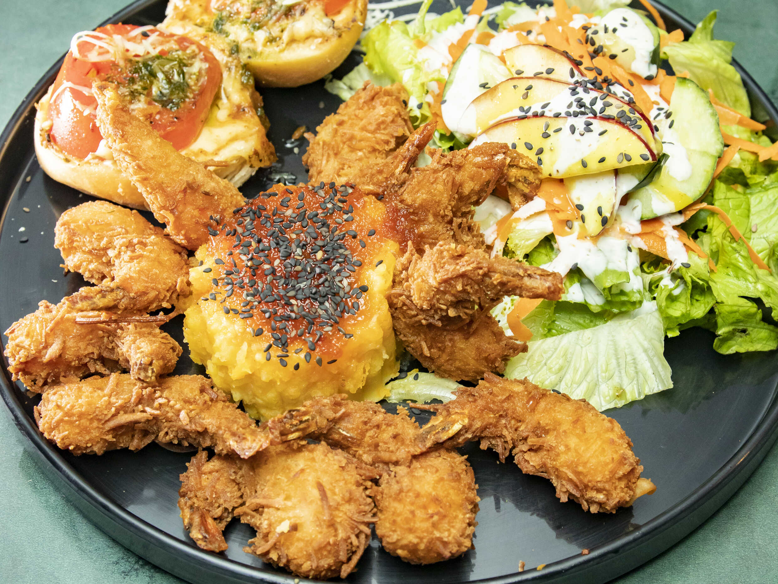 Camarones rebosados con rayadura de coco, acompañados de guarniciones de ensalada y pure de papa con dos montaditos italianos.