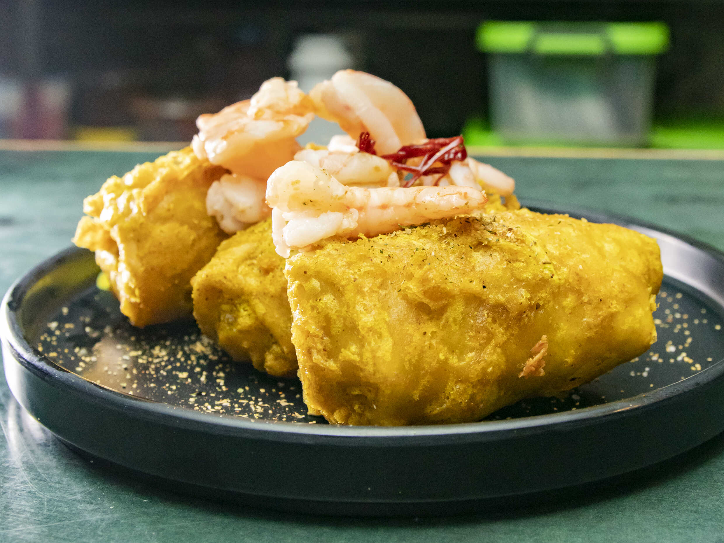 3 Rollitos de harina fritos en tempura de cúrcuma, rellenos con queso mozarela y repollo con zanahoria rayada, 6 camarones salteados al ajillo por fuera, mas aderezo de cúrcuma y cajún.