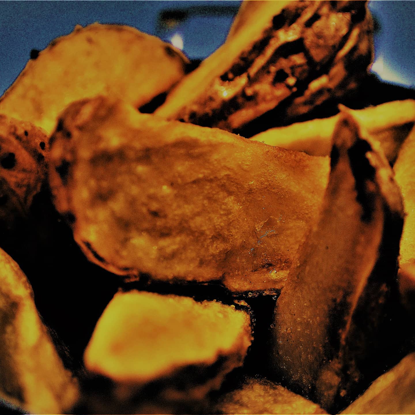 2 Tacos de tortilla de maíz, camarón salteado con ajo y guajillo, queso mozarela fundido, repollo y zanahoria rayados, pico de gallo y aderezo de soya. Guarnición de papas fritas en gajo.