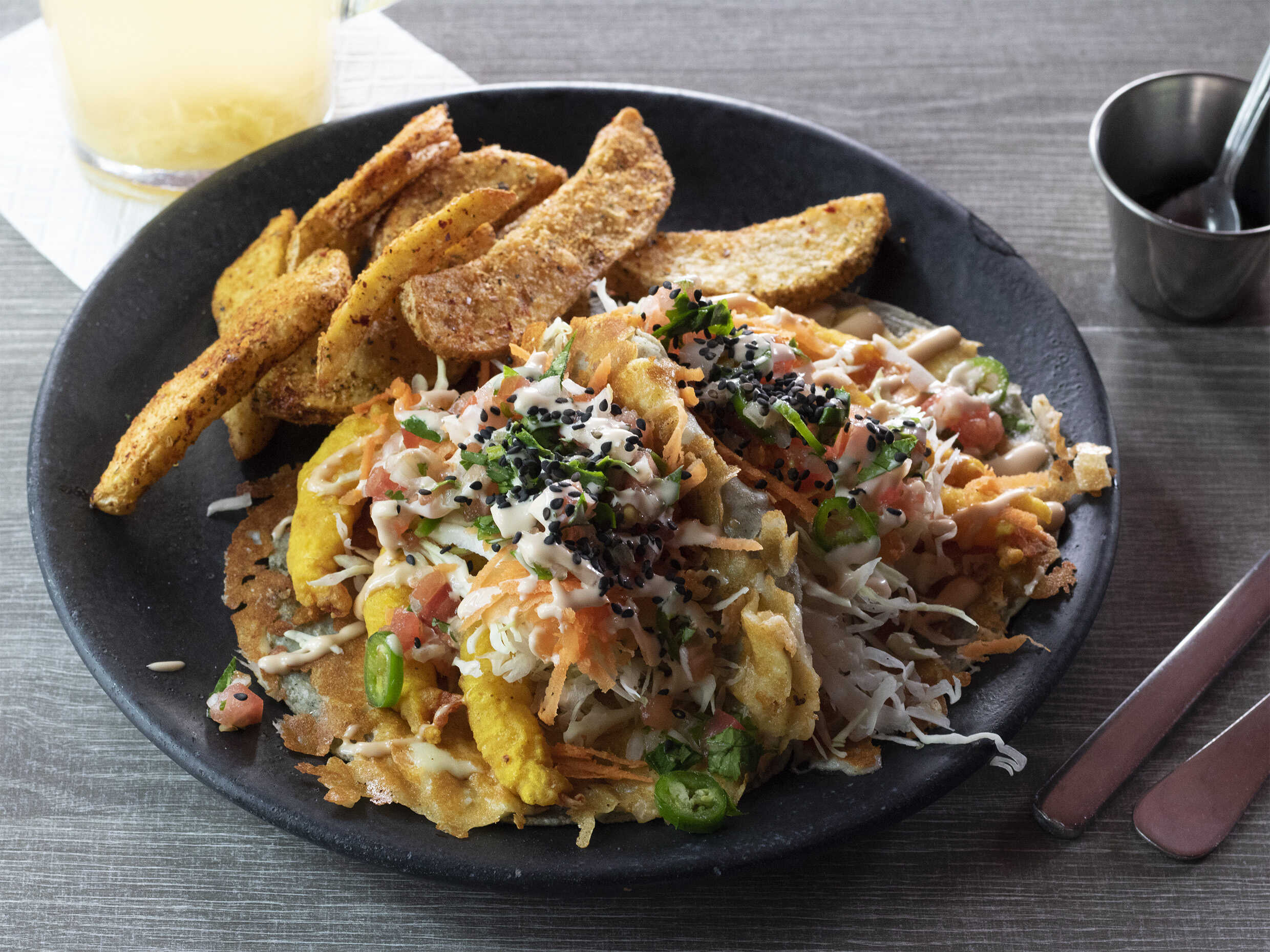 2 tacos de tortilla de maíz, filete tilapia rebozado en tempura de cúrcuma, queso mozarela fundido, repollo y zanahoria rallada, pico de gallo y aderezo de soya. Guarnición de papas fritas en gajo.