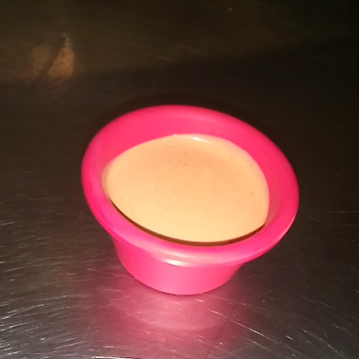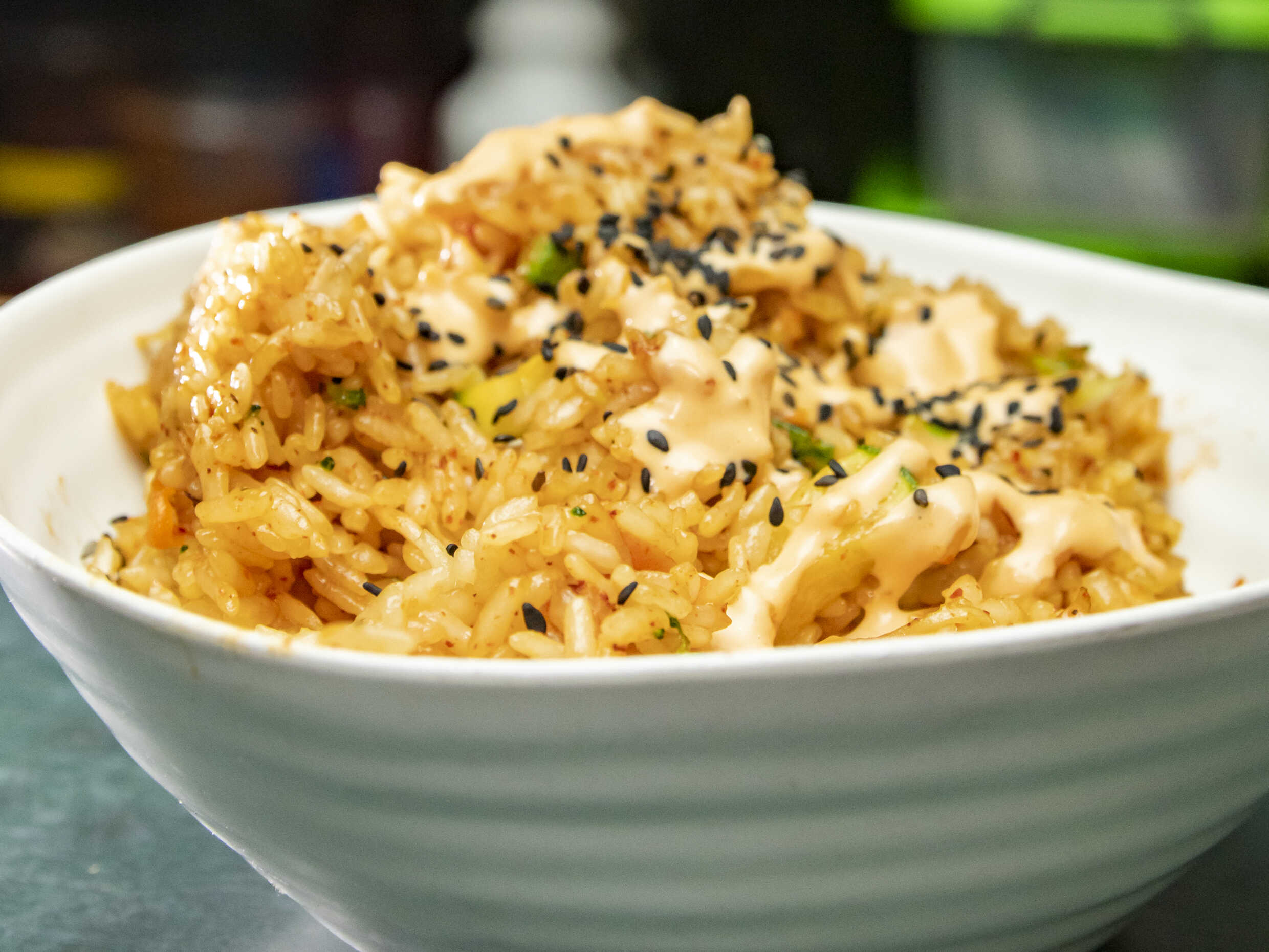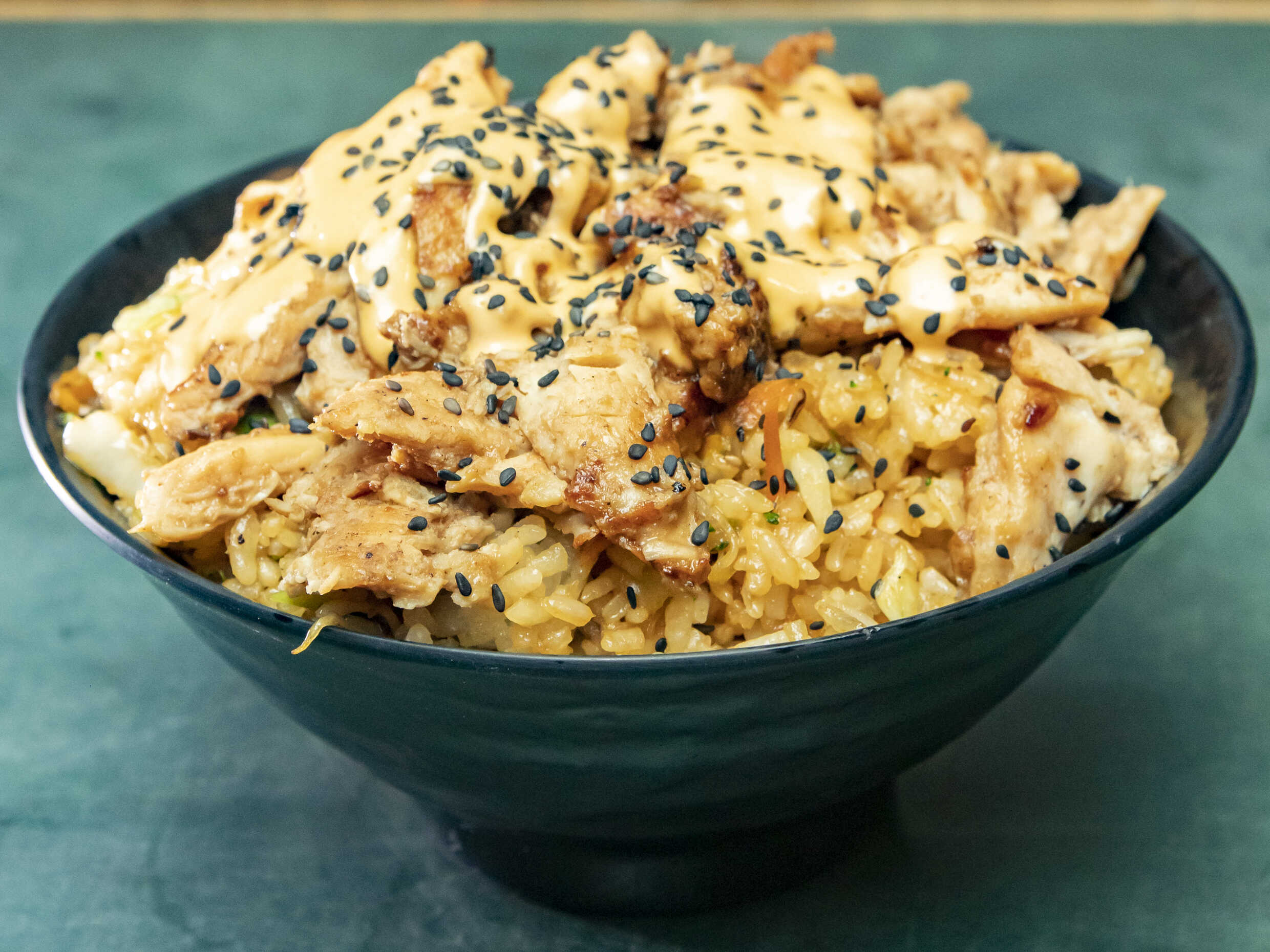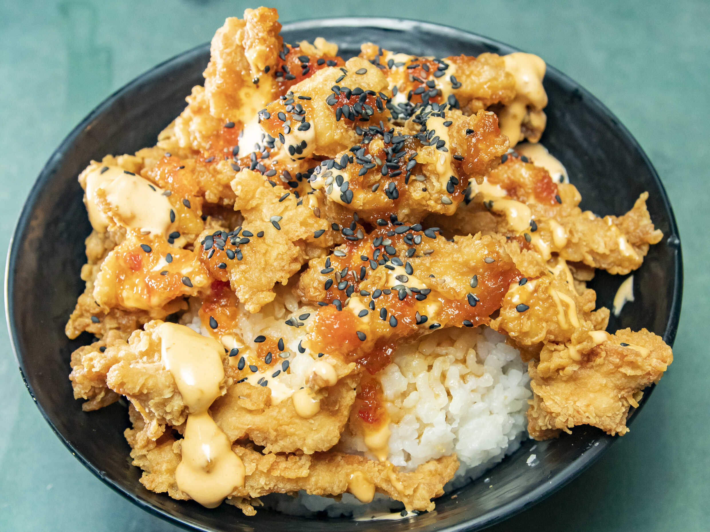 Arroz al vapor con un poco de salsa de soya, chuleta frita, ajonjolí, aderezo sirasha y salsa agridulce.