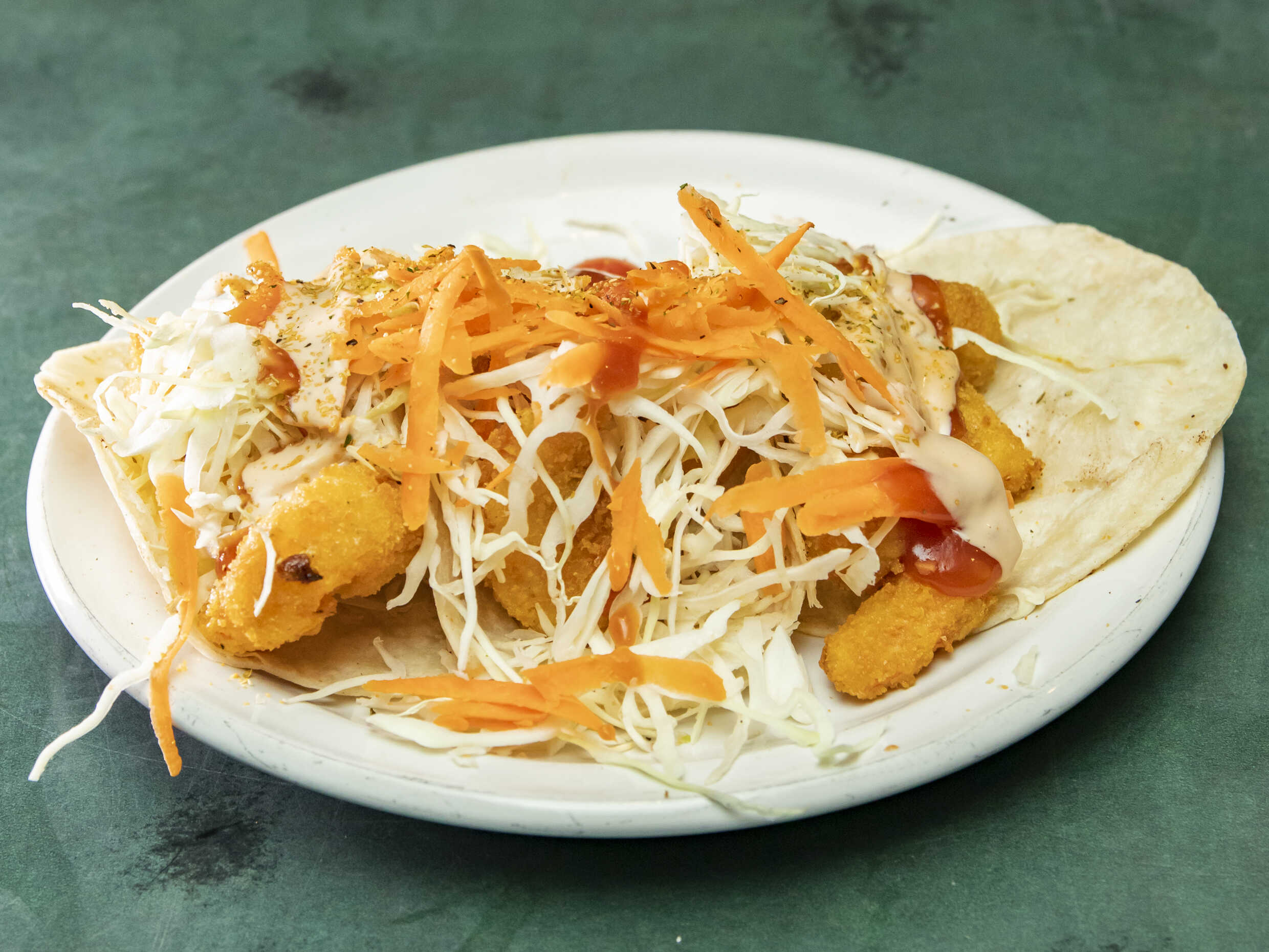Pescado empanizado, tortilla de harina, repollo y zanahoria rallada, cajun, catsup y aderezo de soja