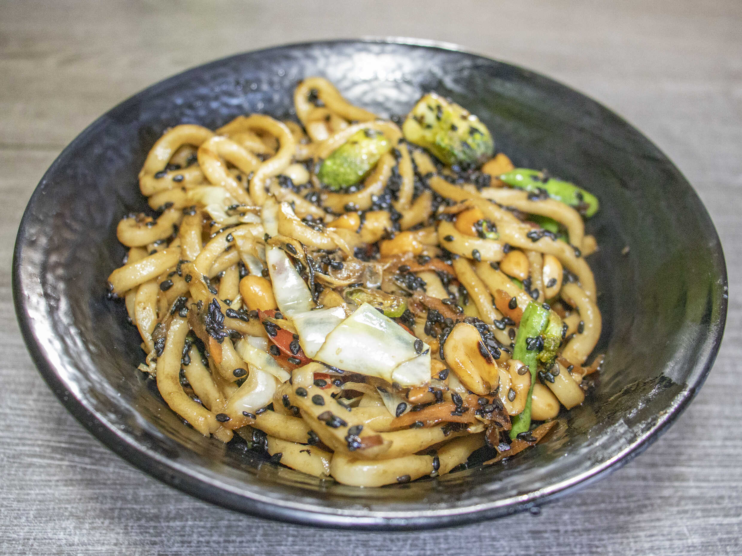Pasta Udon sazonado con el doble de soya, cacahuate, zanahoria y repollo rayados, calabacita, brócoli y ajonjolí.