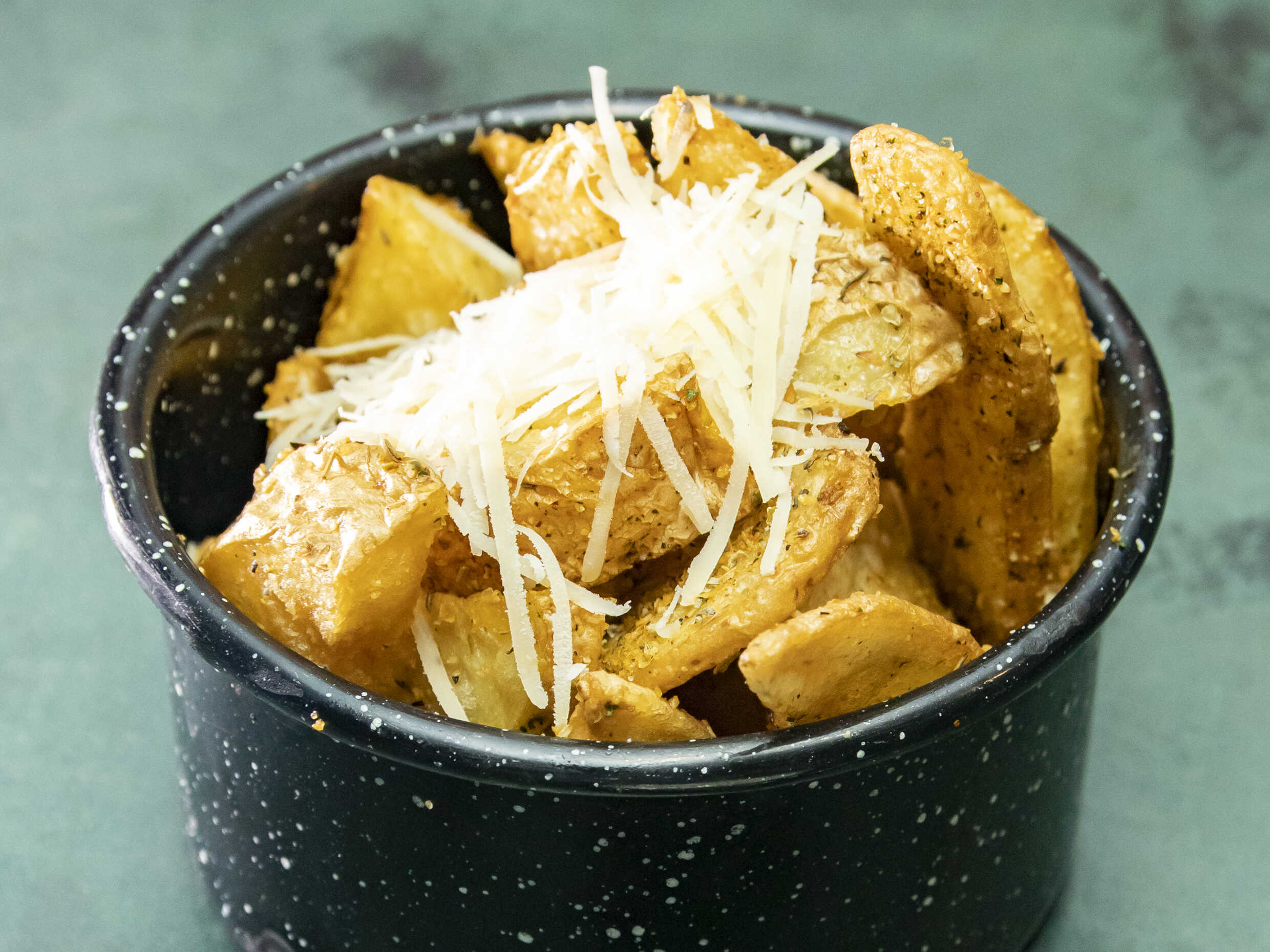 Corte gajo con queso parmesano, hierbas italianas y aderezo de yogurt.