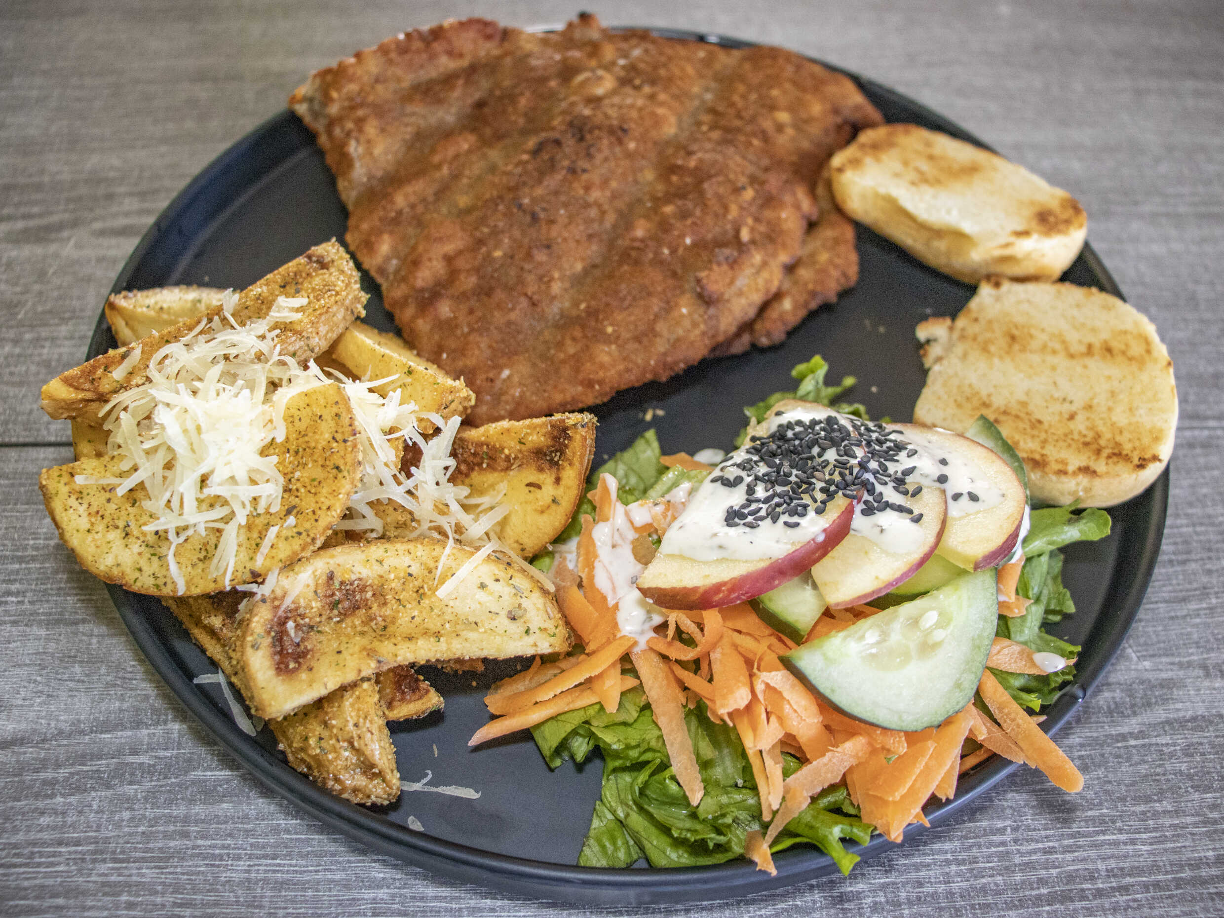 Milanesa de res empanizada con cereal, guarnición de ensalada, papas toscanas y 2 mitades de pan.