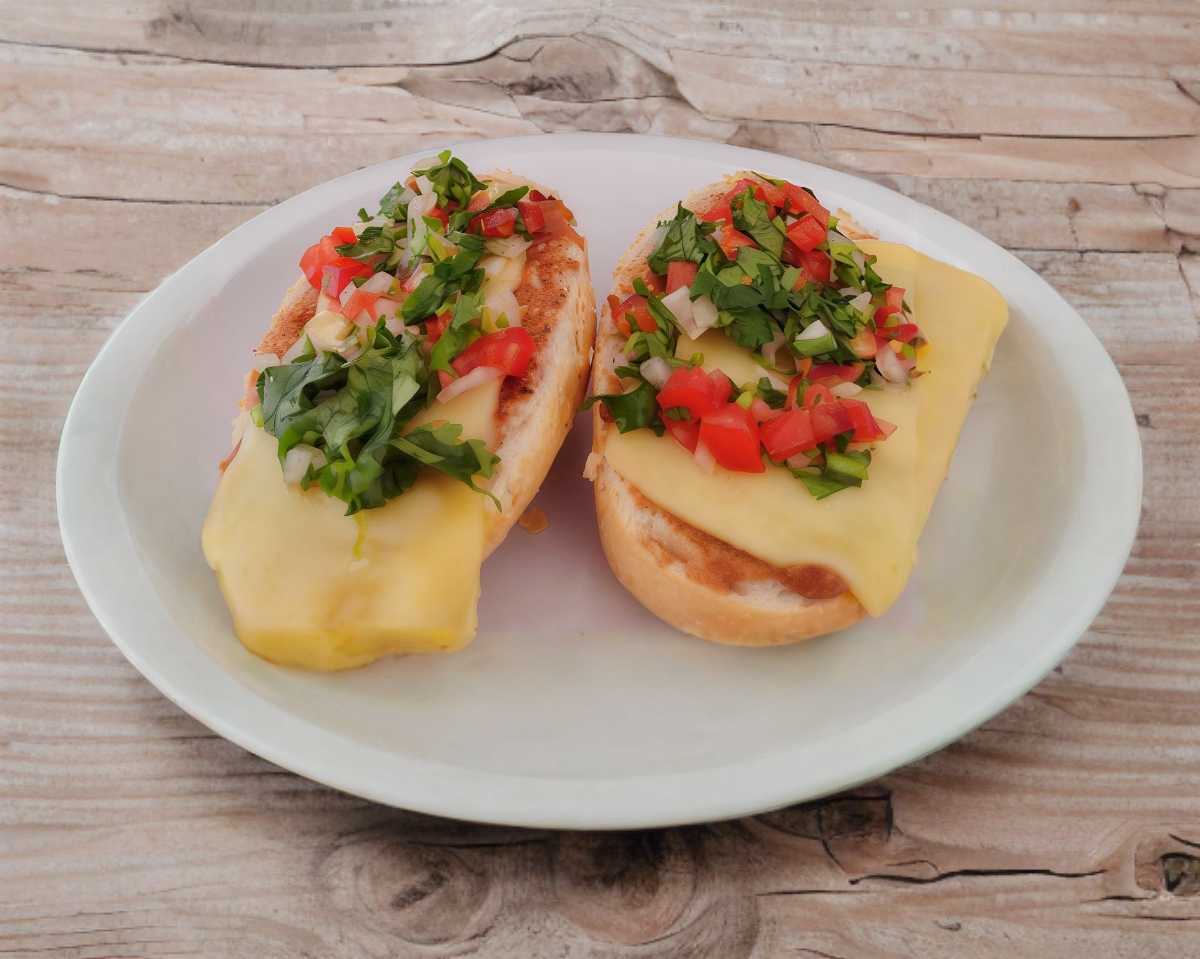 Bolillo con frijoles y queso acompañados de salsa de pico de gallo
