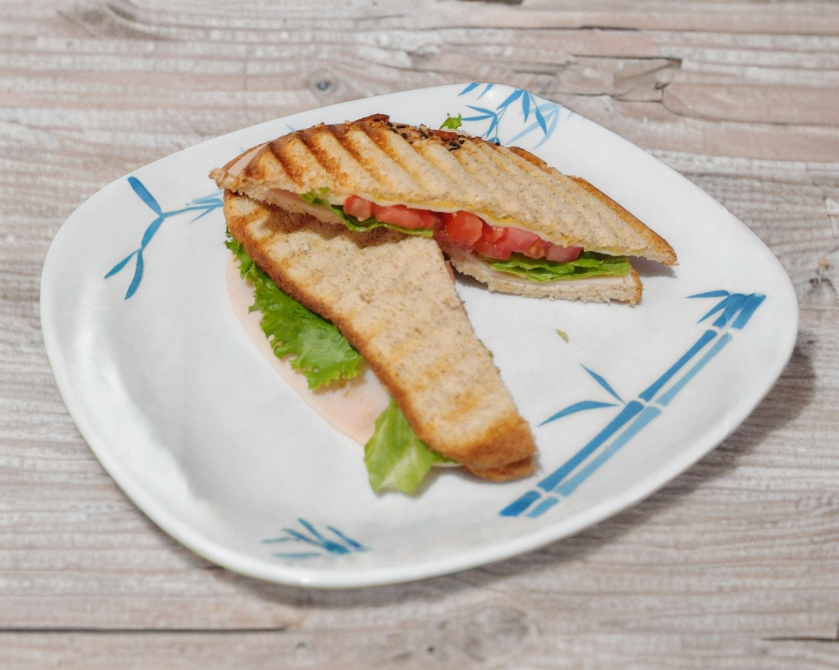 Deliciosa combinación de pan multigrano , queso tipo gouda , pechuga de pavo y lechuga y jitomate