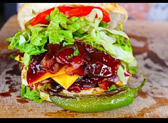 Carne ,tocino , queso , oaxaca, chile en vinagre , myonesa , lechuga , aguacate