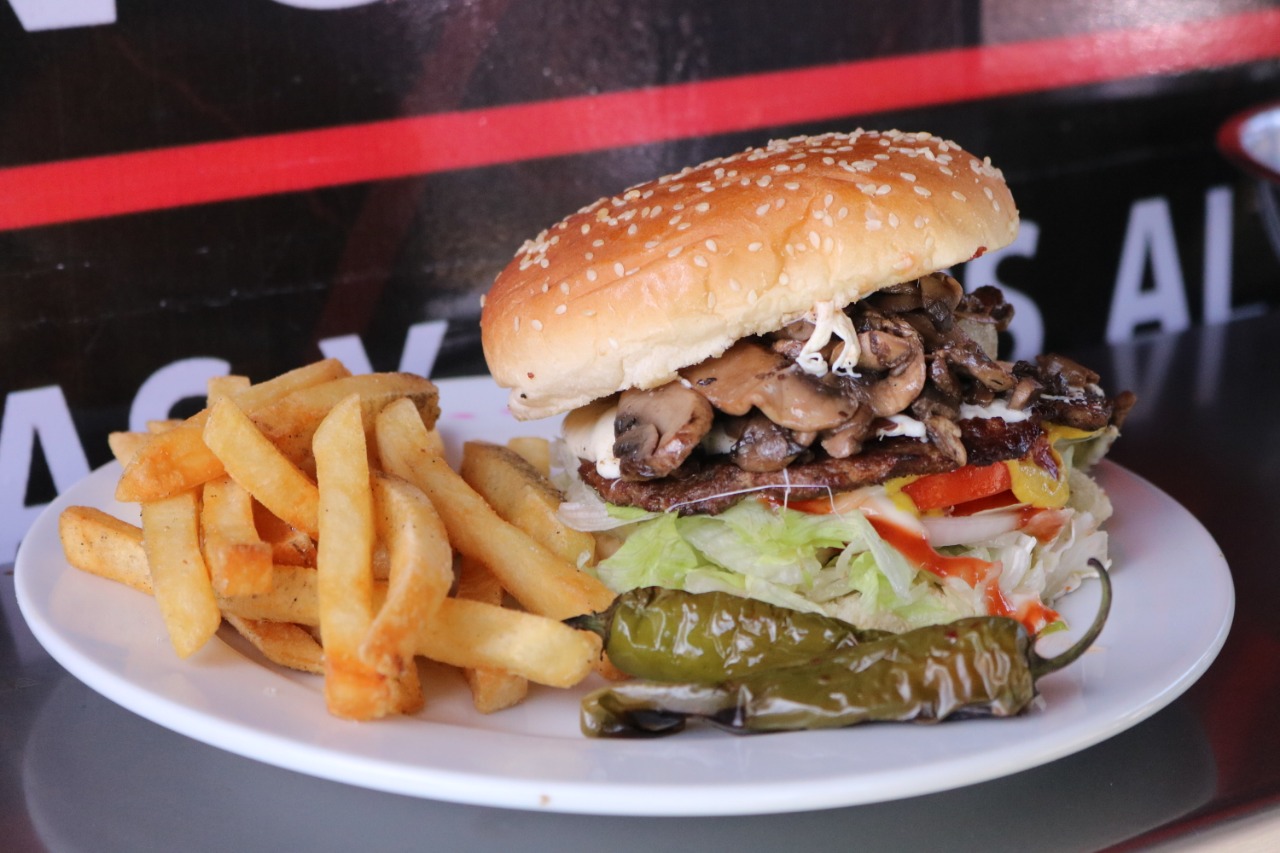 100 Gramos de carne a la parrilla, queso gouda, tocino y champiñones.