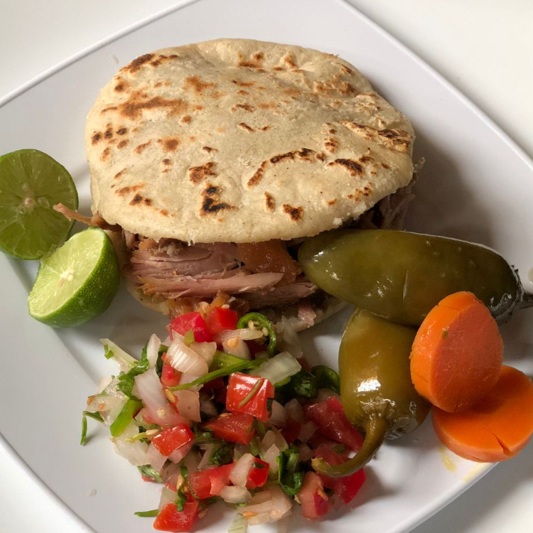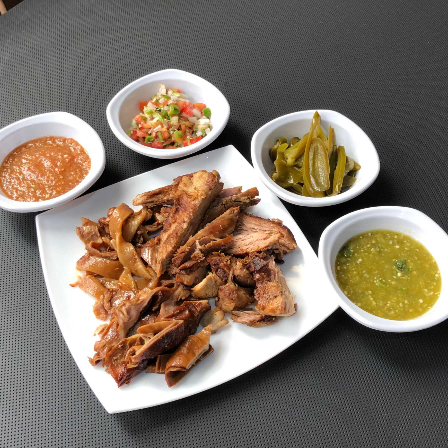 1/4Kg de carnitas, 1 docena de tortillas, chiles jalapeños, pico de gallo, salsa verde, salsa roja.