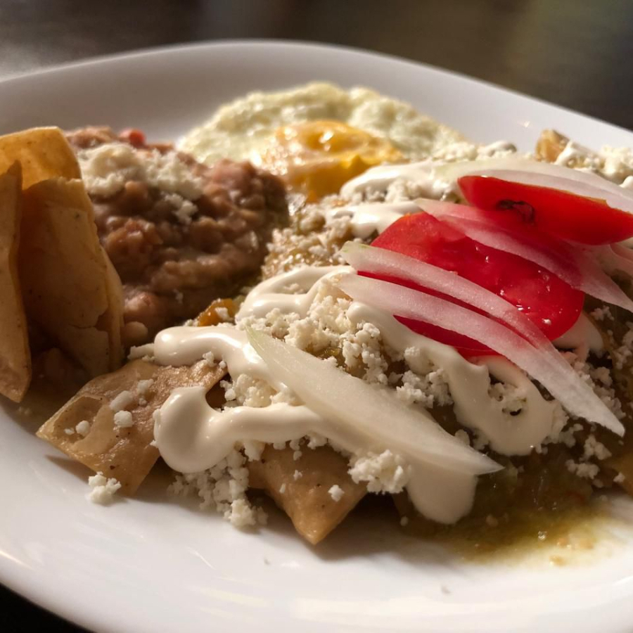 chilaquiles verdes, 1 huevo, frijoles, crema,queso ranchero,jitomate
