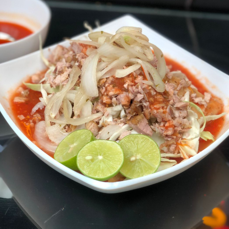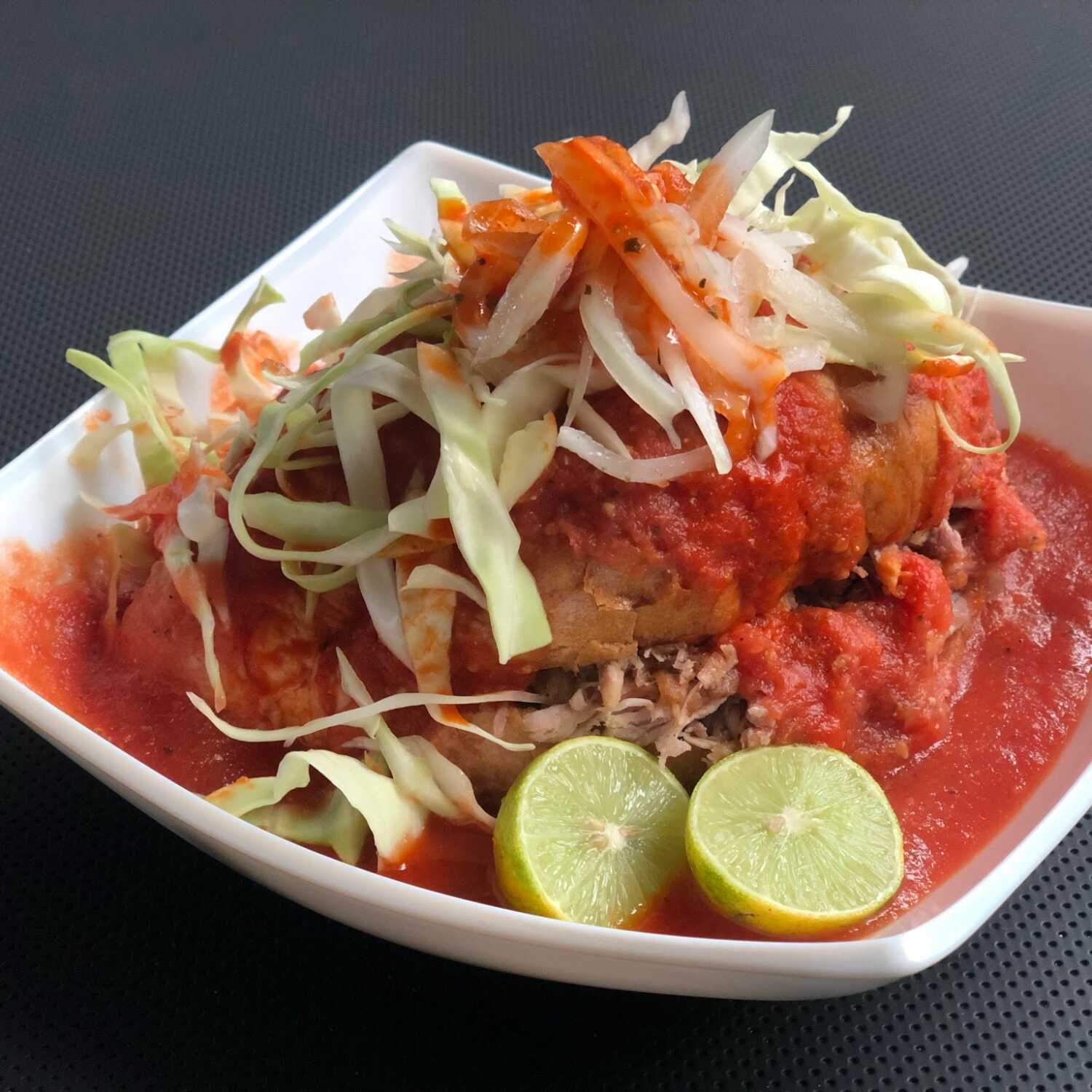 Bolillo con carnitas, cebolla, repollo, salsa tomate, salsa picante.