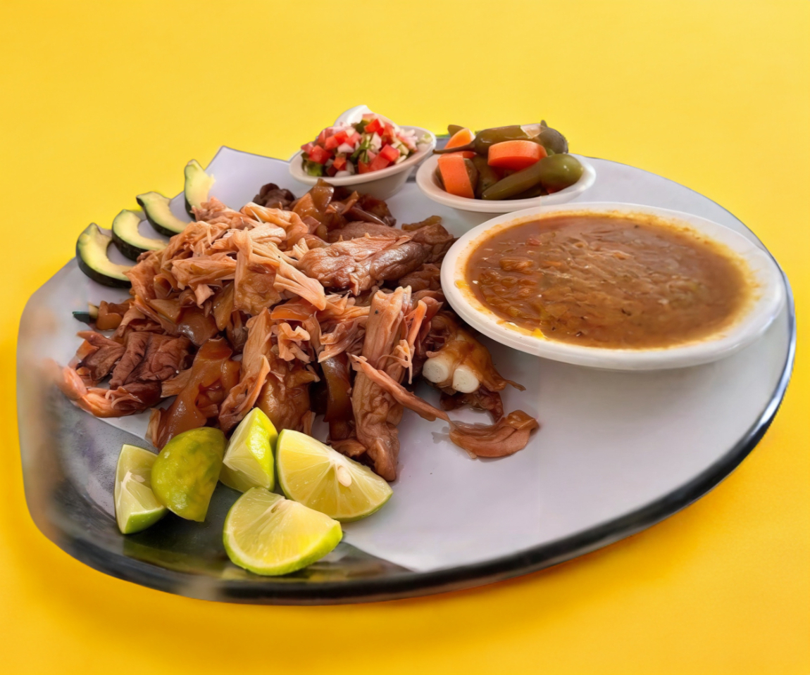 Media Orden de Frijoles 110gr + Agua de Sabor 500 ml + 5 pzas. de Tortillas de comal + 10 pzas de Tortillas + Media orden de Guacamole 110gr + 1/2kg Carnitas "tortillas, salsa, chiles" incluye totopos..!!