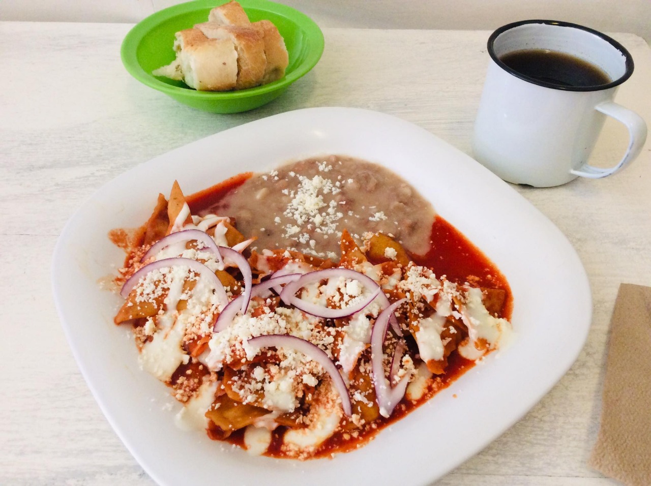 Con queso, crema y cebolla encima. Acompañados de frijoles refritos y pan de leña.