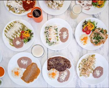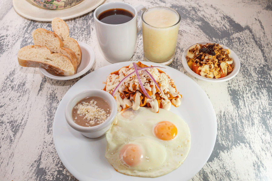8 oz de jugo natural del día, acompañado de un mix de frutas de temporada. 8 oz de tradicional café de olla, con ese toque especiado que lo hace único. 2 huevos al gusto (estrellados, revueltos o como prefieras).Chilaquiles verdes o rojos, a tu elección, acompañados de frijoles refritos con queso. 3 piezas de pan recién horneado para complementar tu desayuno.