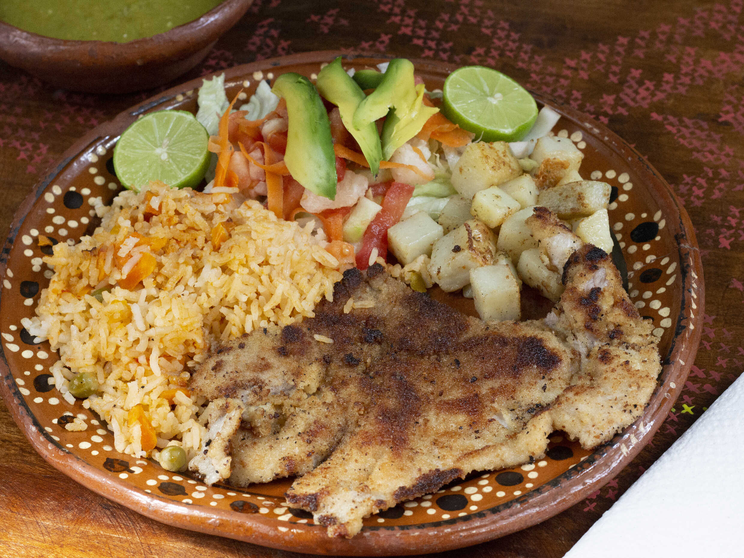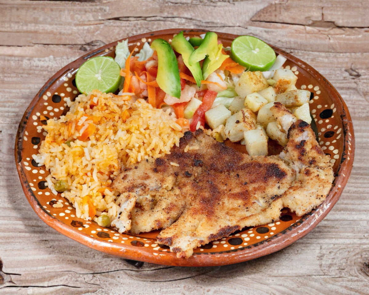 Filete empanizado acompañado de frijoles o arroz, papas cocidas con mantequilla, ensalada y tortillas.