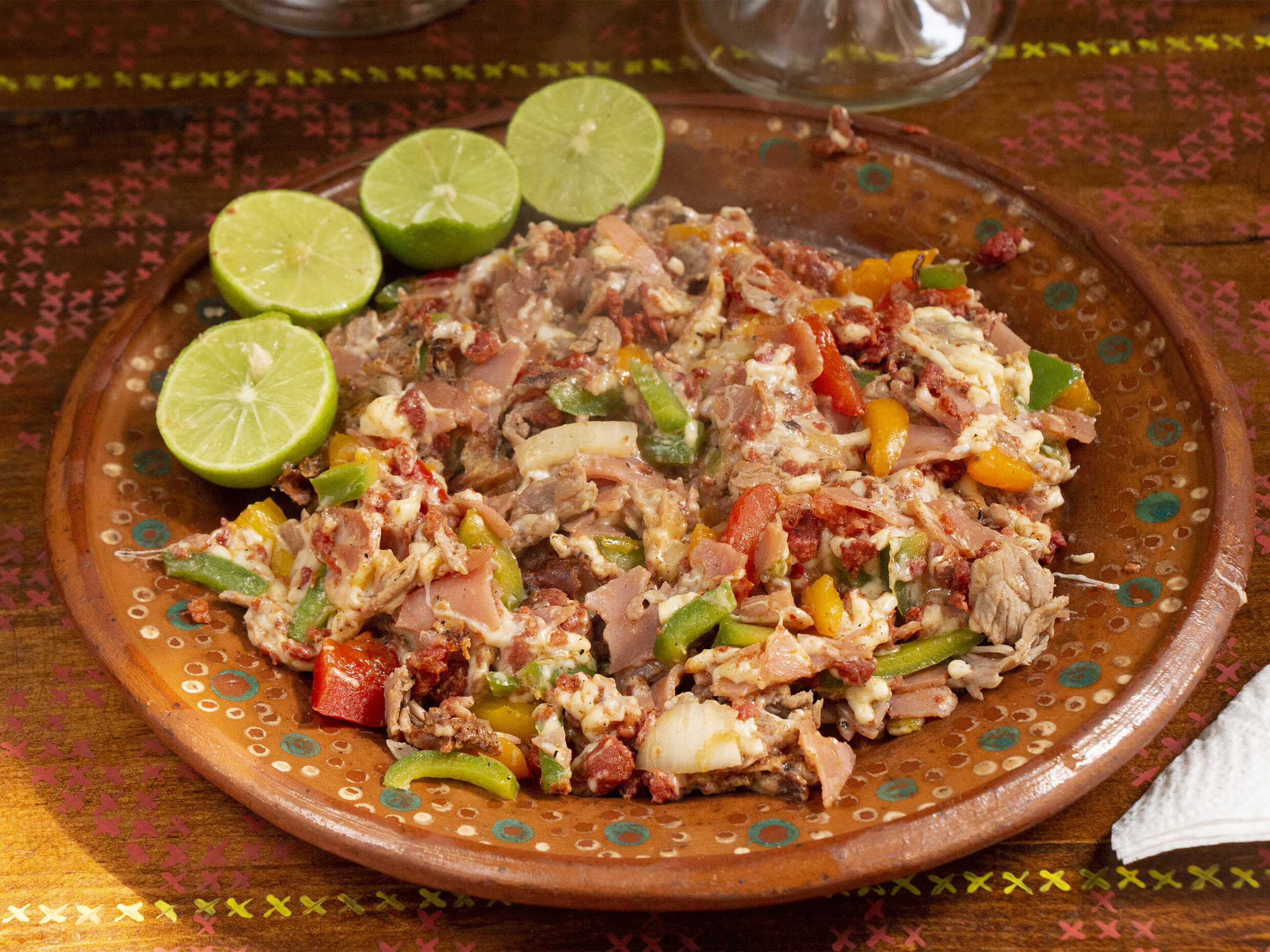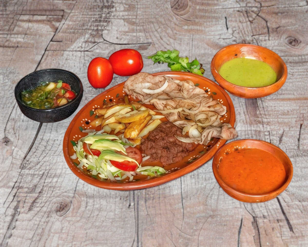 Mezcla de pimientos morrones, cebolla, bistec, chorizo, jamón, queso y acompañada de tortillas y limones.
