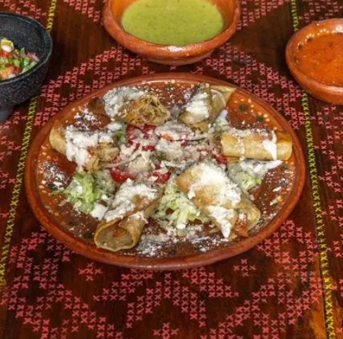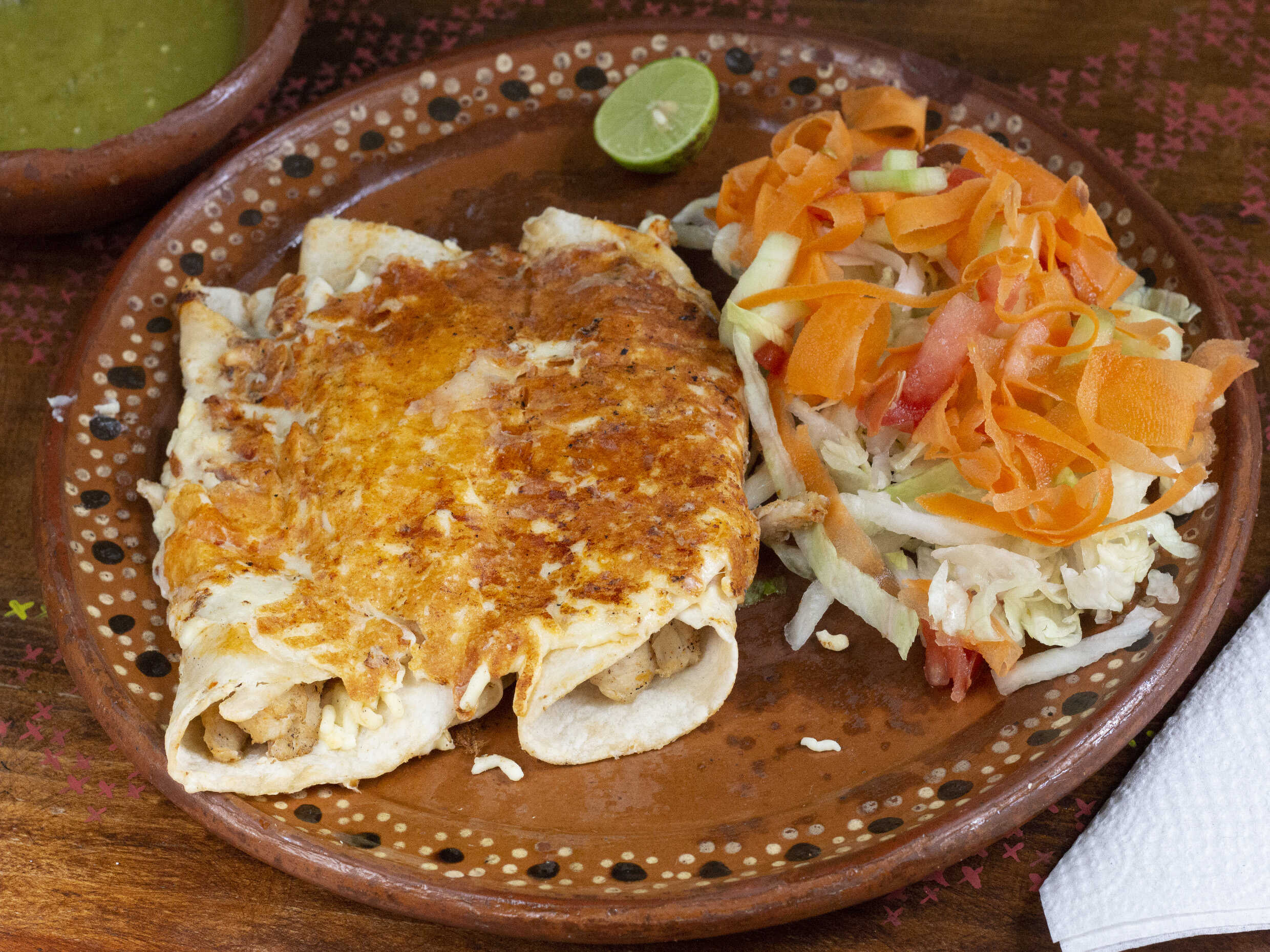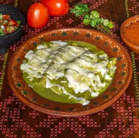 De tortilla de harina o maíz, rellenas de pollo y bañadas en salsa verde con crema y queso gratinado.