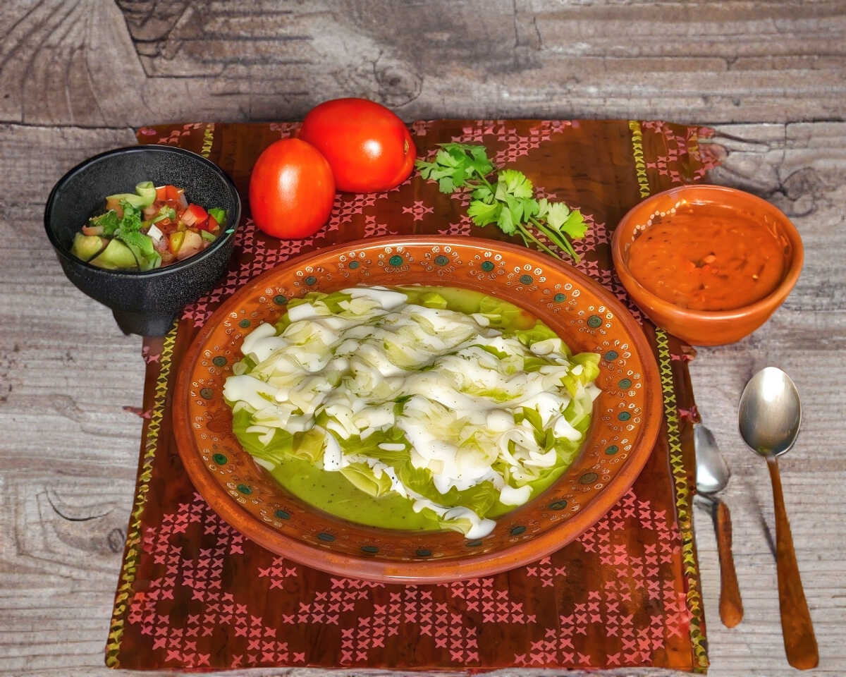 Clásico desayuno mexicano a base de totopos, de maíz bañados en salsa verde, con crema, queso, pico de gallo y acompañados de huevos estrellados y frijoles.