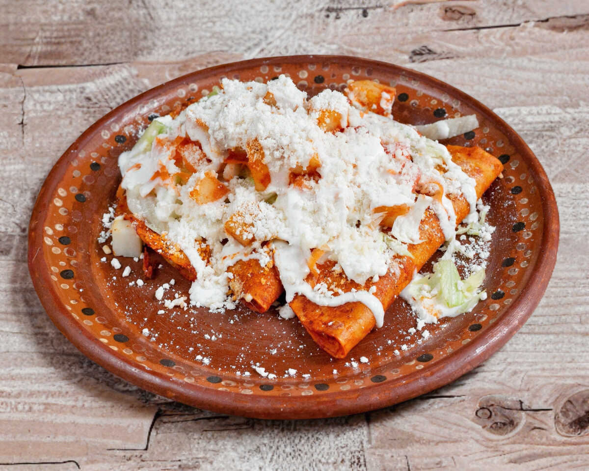 De tortilla de maiz, rellenas de pollo, cubiertas de ensalada, papas, crema y queso.