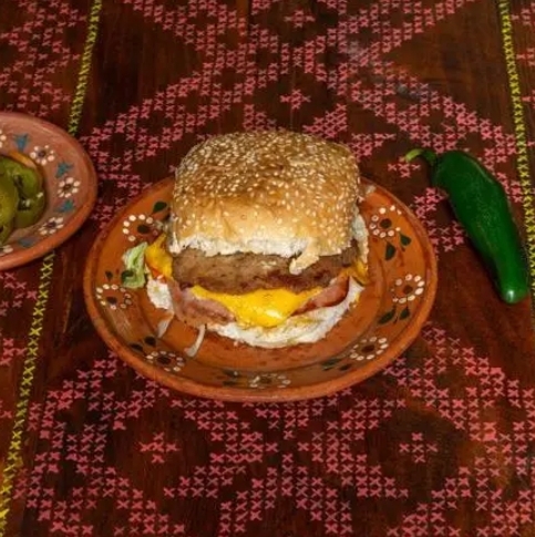 Mezcla de carnes de res y cerdo, jamón, queso asadero, queso amarillo, salsa BBQ, crema, catsup, mostaza y verduras frescas.